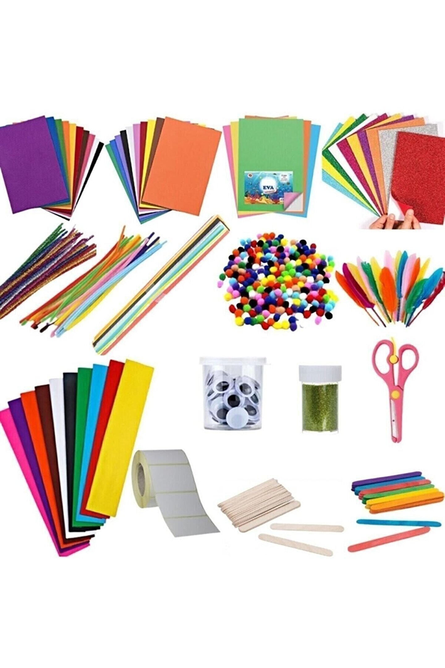 Anaokulu Etkinlik Seti İçeriği; 1 Paket A4 Eva 10'lu; 1 Paket A4 Simli Yapışkanlı Eva 10'lu; 1 Paket a4 Yapışkanlı Eva 10'lu; 1 Paket A4 Keçe 10lu; 1 Paket Krapon Kağıdı 10 lu (50cmX2mt); 1 Paket Renkli Dil çubuğu (50 Adet); 1 Paket Boyasız Dil Çubuğu (50 Adet); 1 Paket Şönil; 1 Paket Simli Şönil; 1 Tüp Toz sim; 1 Tüp oynar göz; 1 Paket 10 Renk Fon Kartonu (25cmX35cm); 1 Paket Renkli Tüy; 1 Paket Ponpon; 1 Rulo Beyaz Etiket (Malzemelerin üzerine isim yazmak için); 1 Paket A4 Elişi Kağıdı (10 Renk); 1 Adet Küt Uçlu Makas;;
