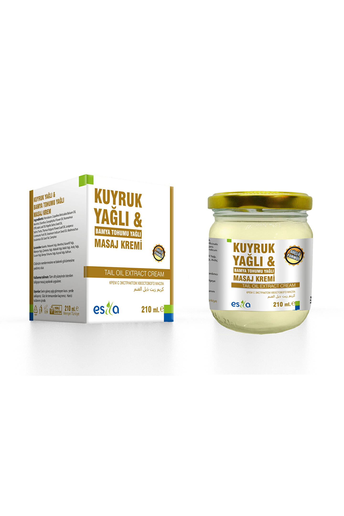 Esila Kuyruk Yağlı ve Bamya Tohumu Yağlı Masaj Kremi 210 Ml İçindekiler Kuyruk Yağı, Bamya Tohumu Yağı, Pelesenk Yağı, Mentol, Karanfil Yağı, Biberiye Yağı, Çörekotu Yağı, Alabalık Yağı, Kekik Yağı, Ardıç Yağı, Susam Yağı, Vazelin, Kâfurun Kullanma Talimatı Tüm cilt yüzeyinde istenilen bölgeye masaj yapılarak uygulanır.