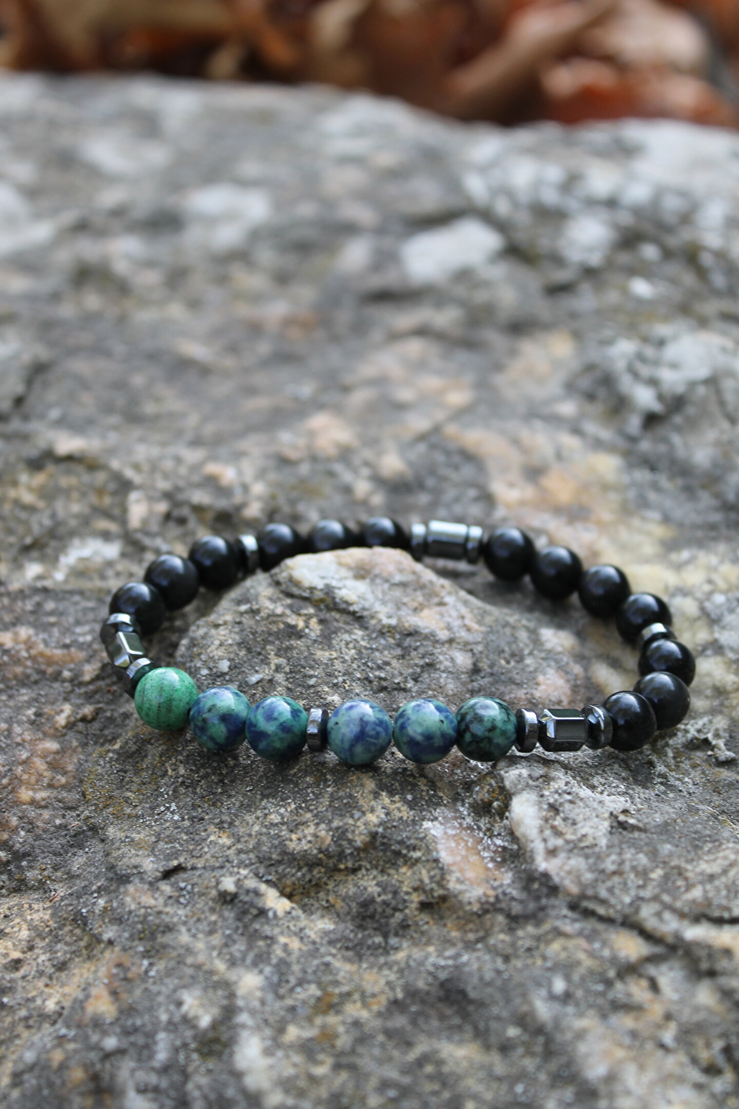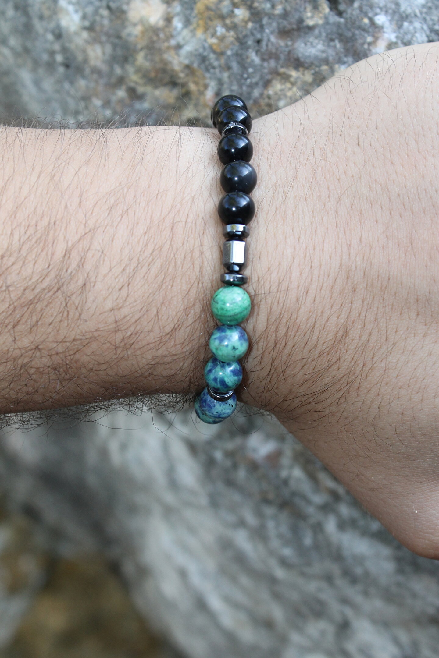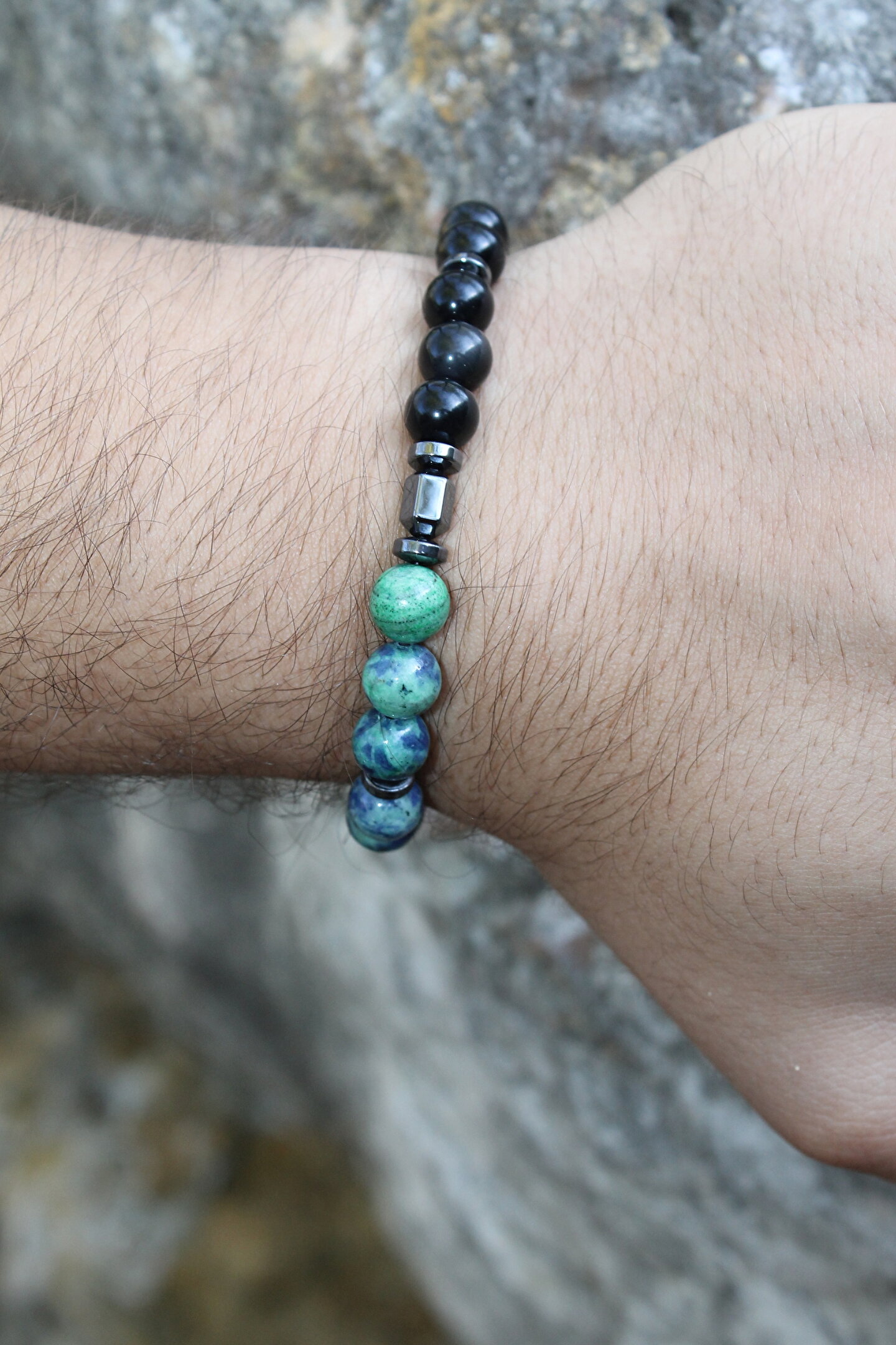 Doğal taş materyali ile üretilmiş, şıklığı ve doğallığı bir arada sunan Azurit obsidyen bileklik; Azurit obsidyen taşı, benzersiz desenleri ve renkleriyle dikkat çekerken, bileklikte zarif bir görünüm sağlar; Her bir bileklik, el yapımı olup, her bir parçada bulunan detaylar özenle işlenmiştir ve bu da onu özel bir aksesuar haline getirir;