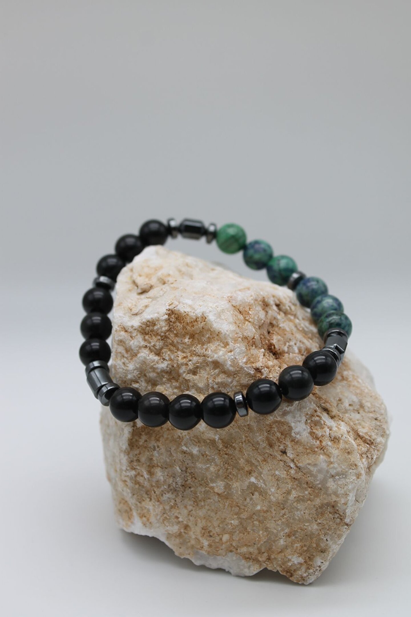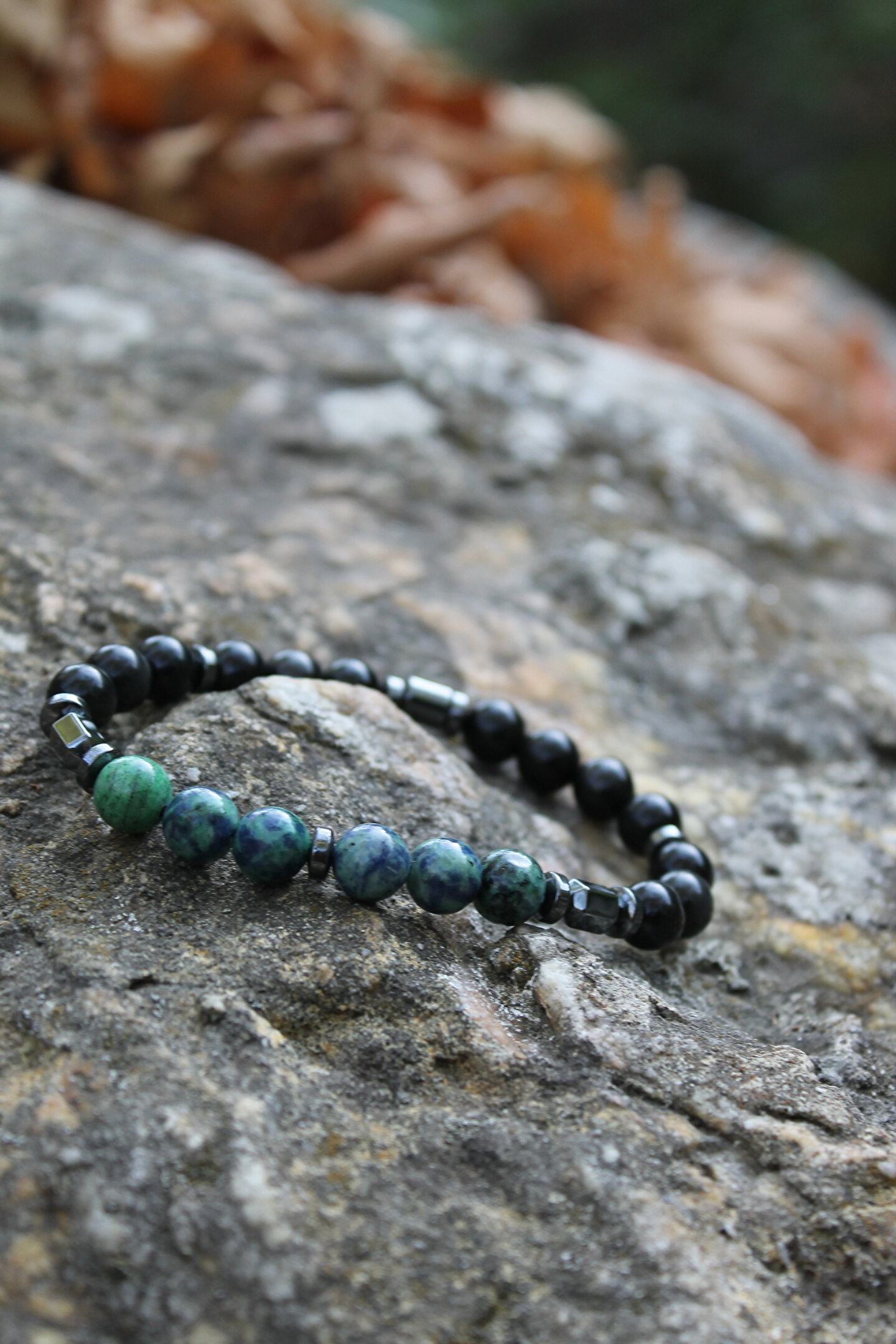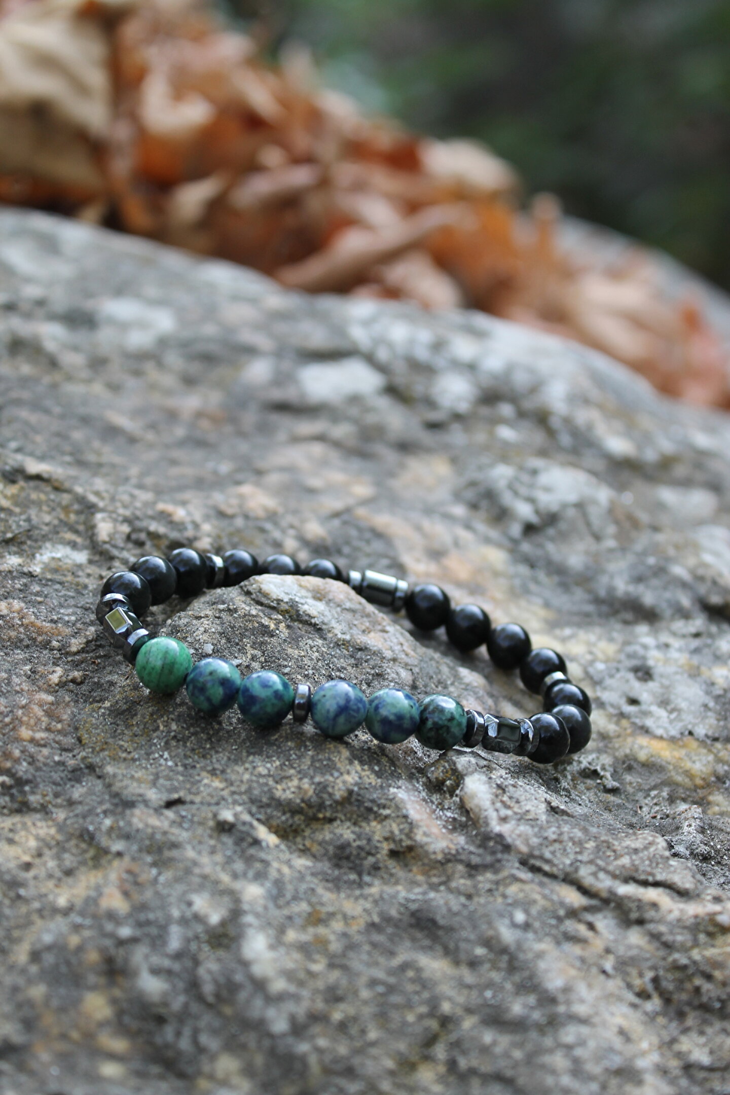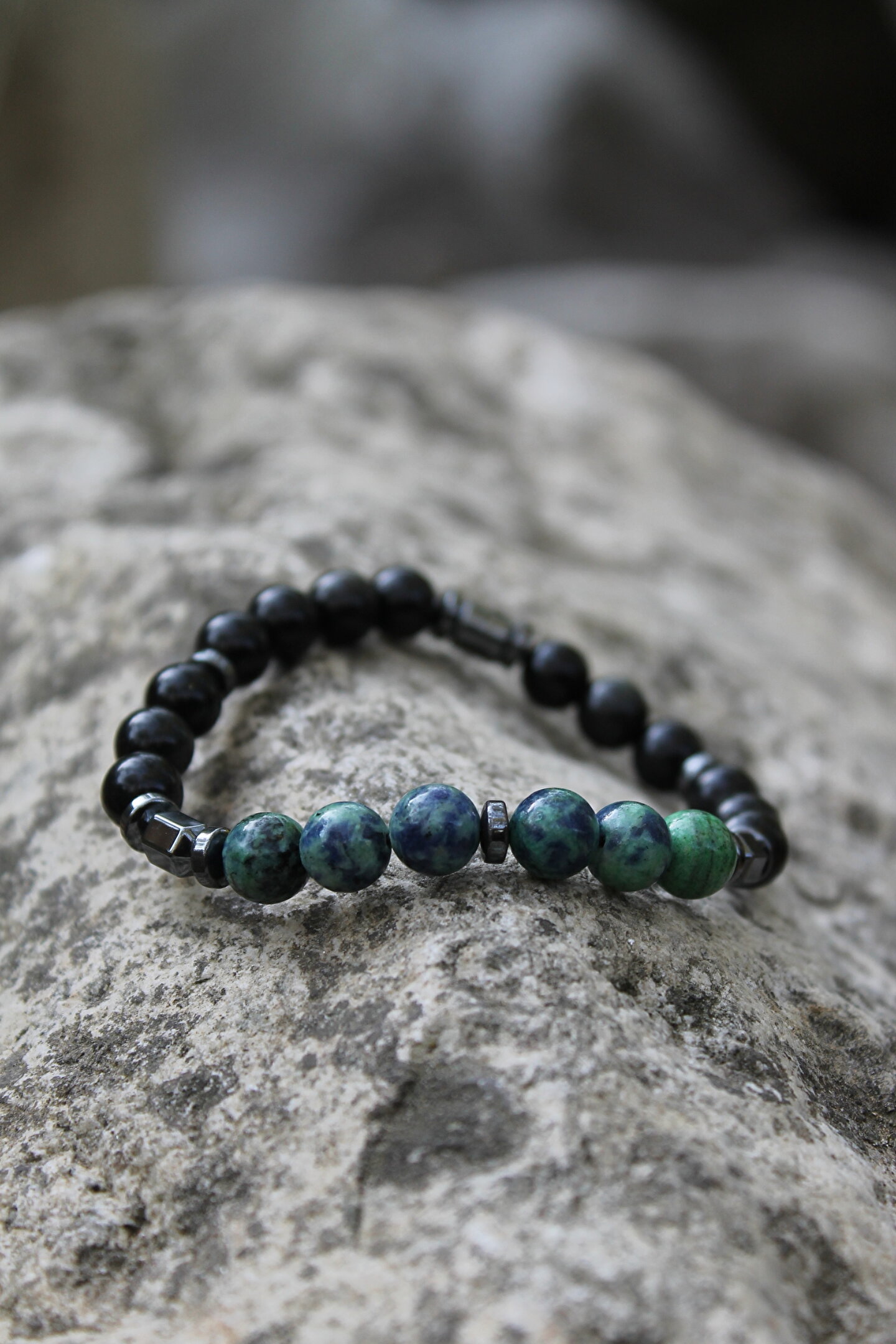 Doğal taş materyali ile üretilmiş, şıklığı ve doğallığı bir arada sunan Azurit obsidyen bileklik; Azurit obsidyen taşı, benzersiz desenleri ve renkleriyle dikkat çekerken, bileklikte zarif bir görünüm sağlar; Her bir bileklik, el yapımı olup, her bir parçada bulunan detaylar özenle işlenmiştir ve bu da onu özel bir aksesuar haline getirir;
