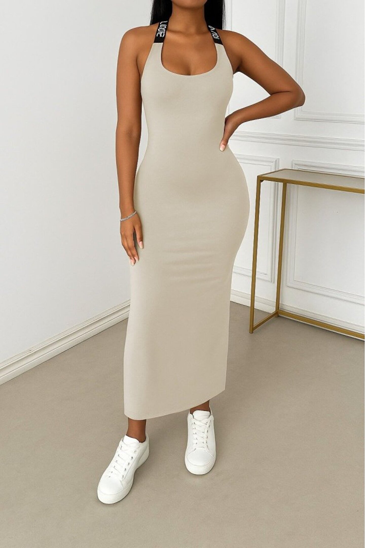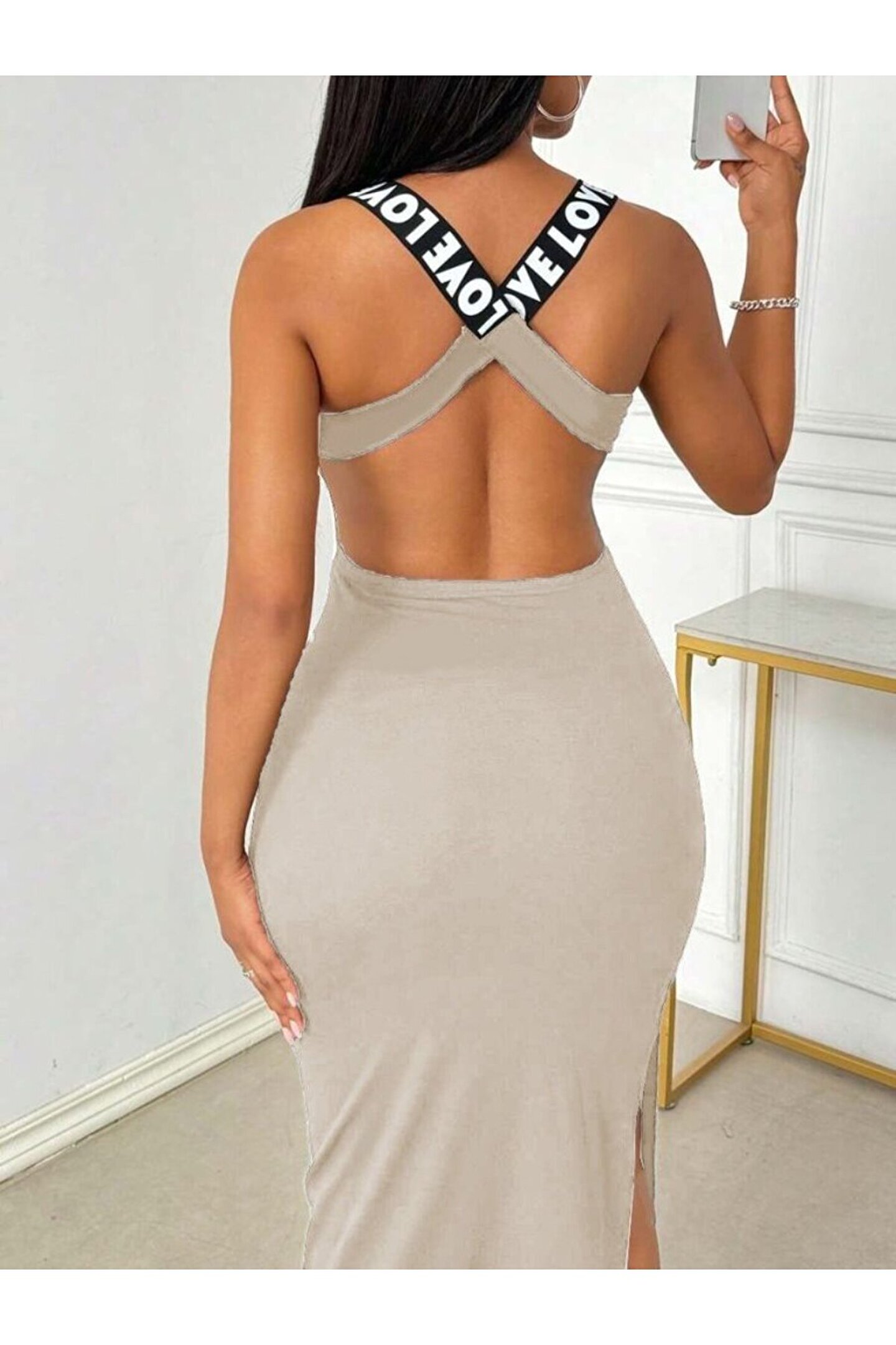 Kadın Yuvarlak Yaka Sırttan çapraz şerit Love Detaylı Yırtmaçlı Viskon Elbise