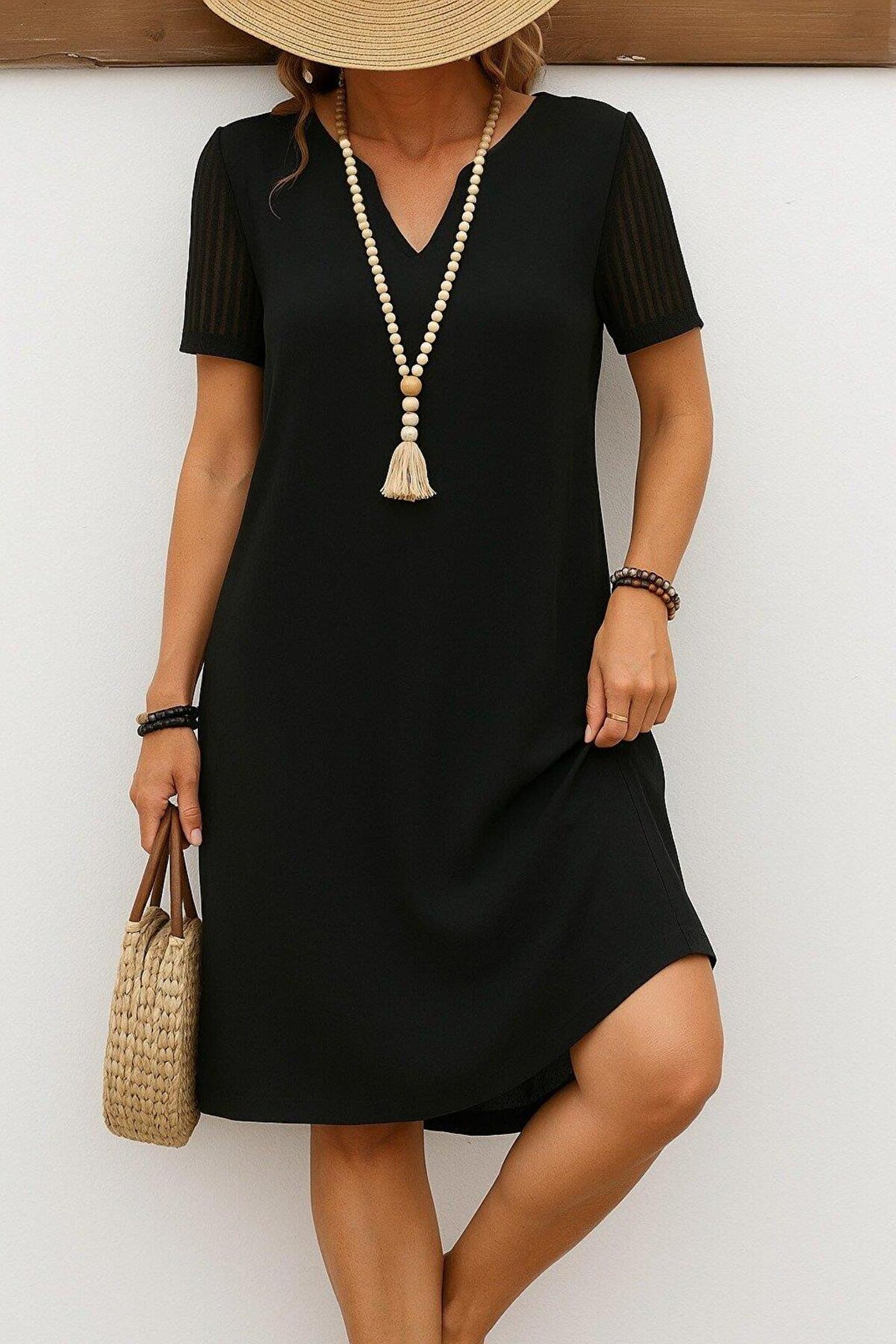 ESSE BUTİK Kadın Kısa Kollu V Yakalı Kısa Janjan Krep Elbise