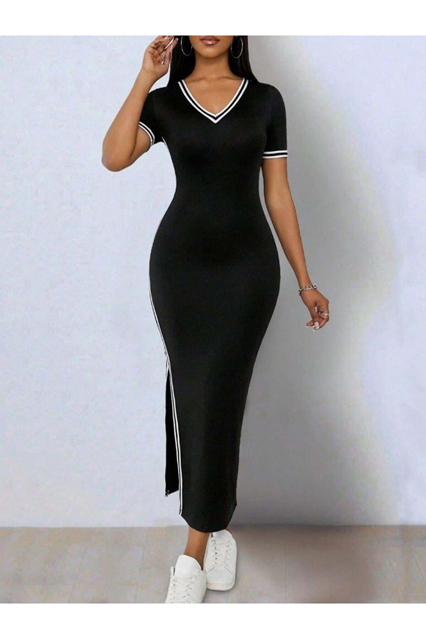Kadın Kısa Kollu V Yakalı Yandan Yırtmaçlı Viskon Iki Iplik Elbise