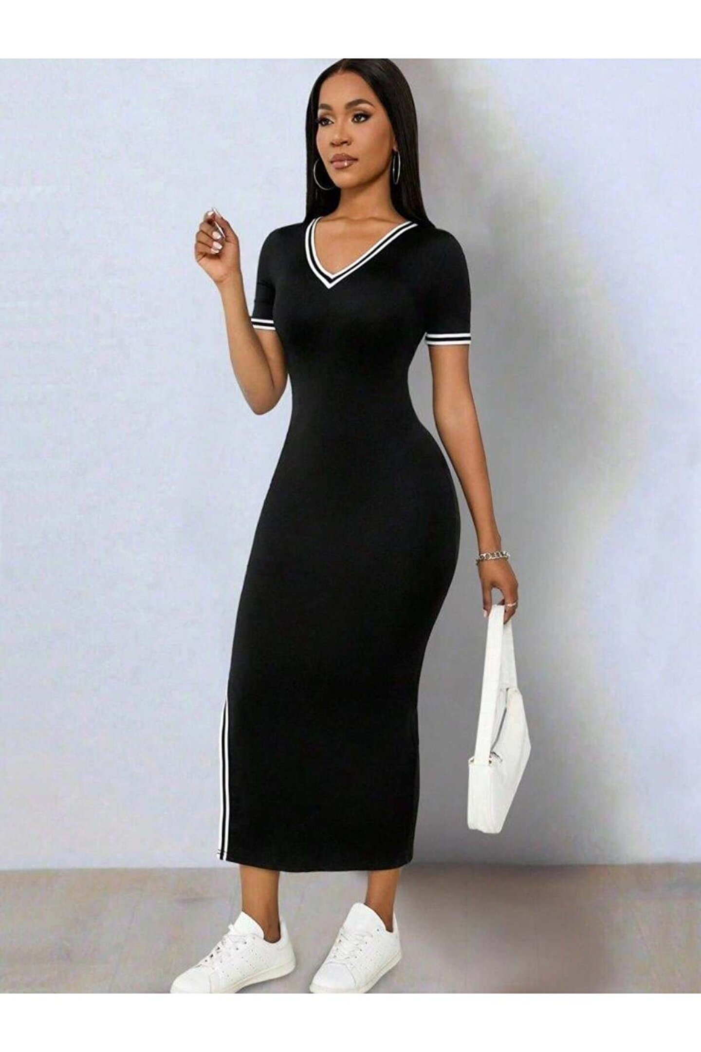 Kadın Kısa Kollu V Yakalı Yandan Yırtmaçlı Viskon Iki Iplik Elbise