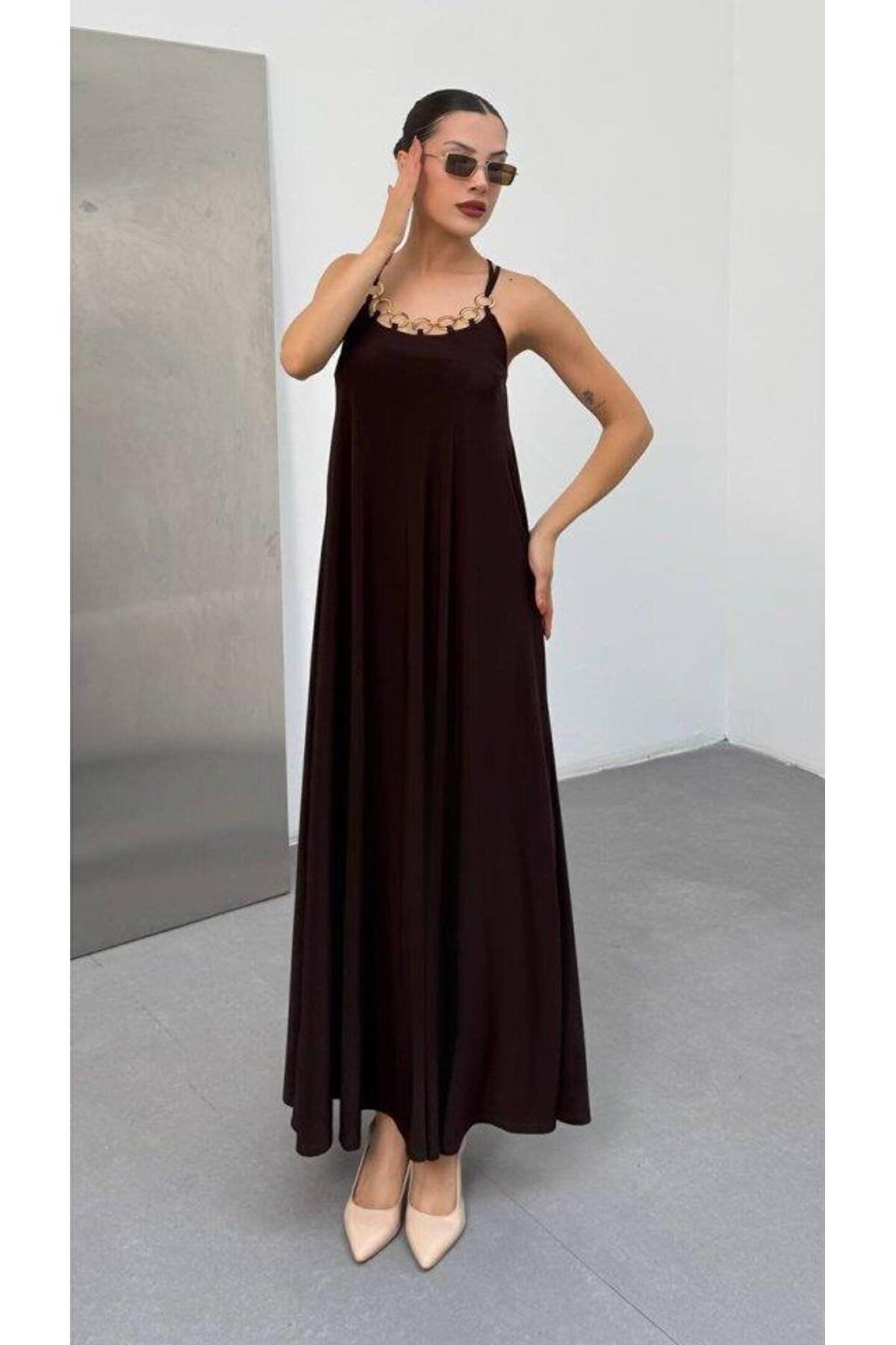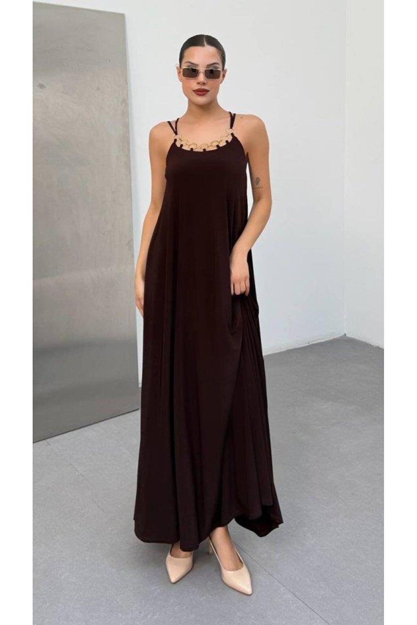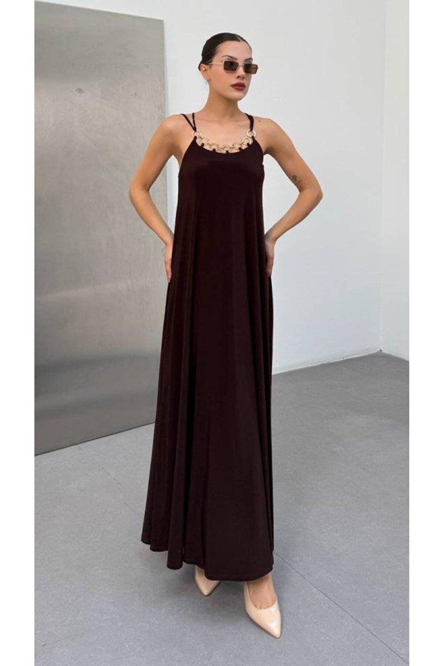 ESSE BUTİK Kadın Omuz Askılı Kuş Gözü Zincir Detay Sandy Kumaş Maxi Boy Elbise
