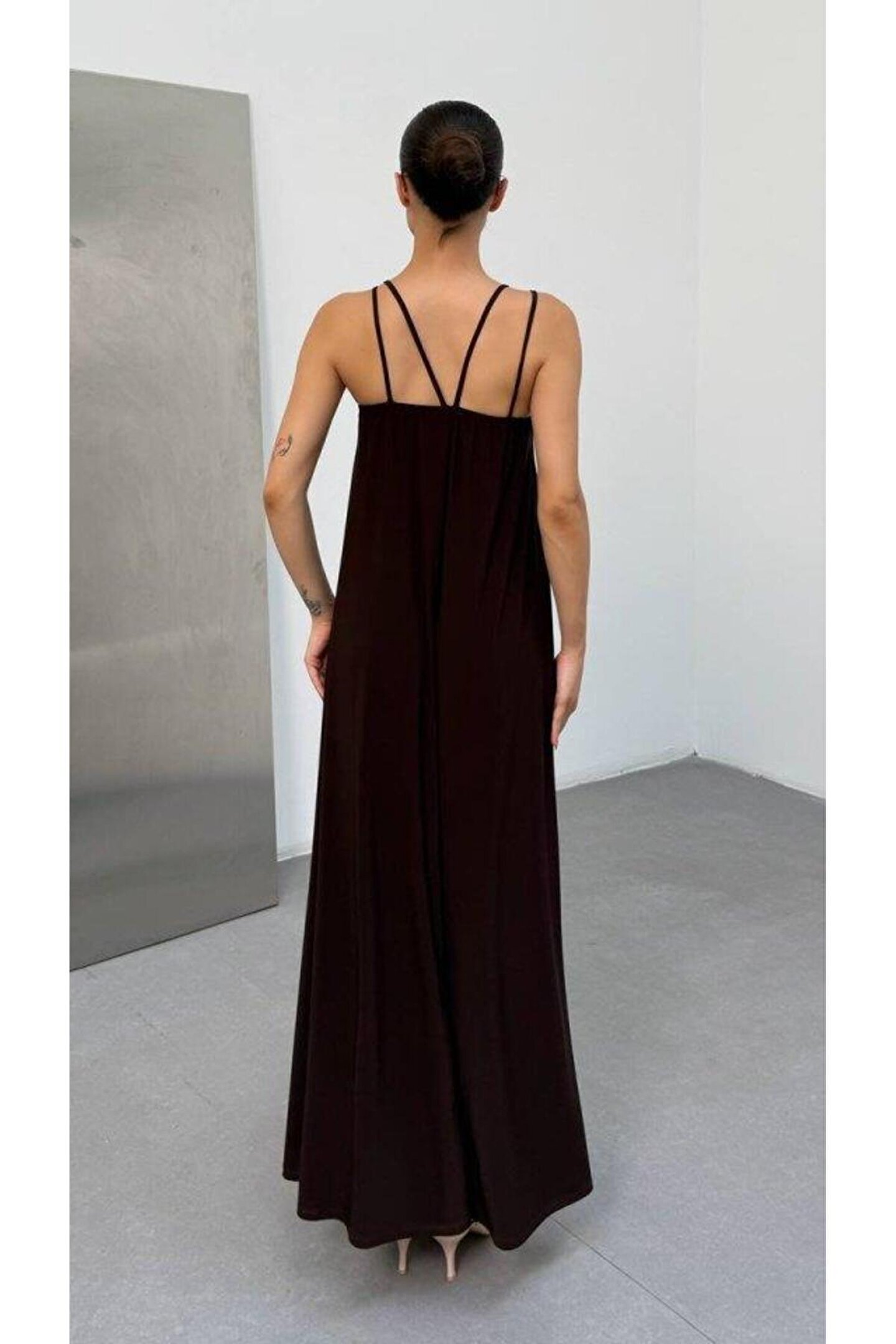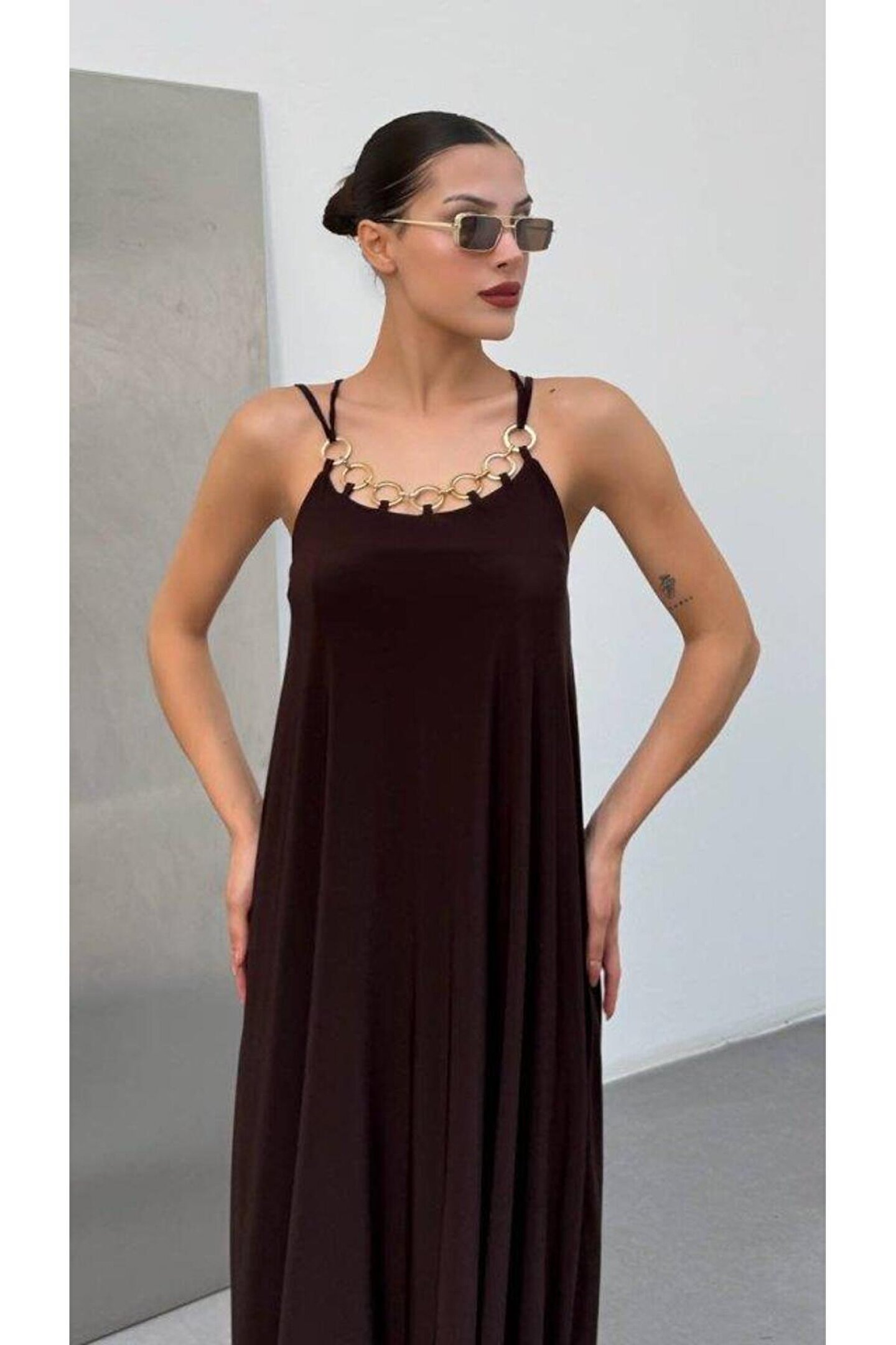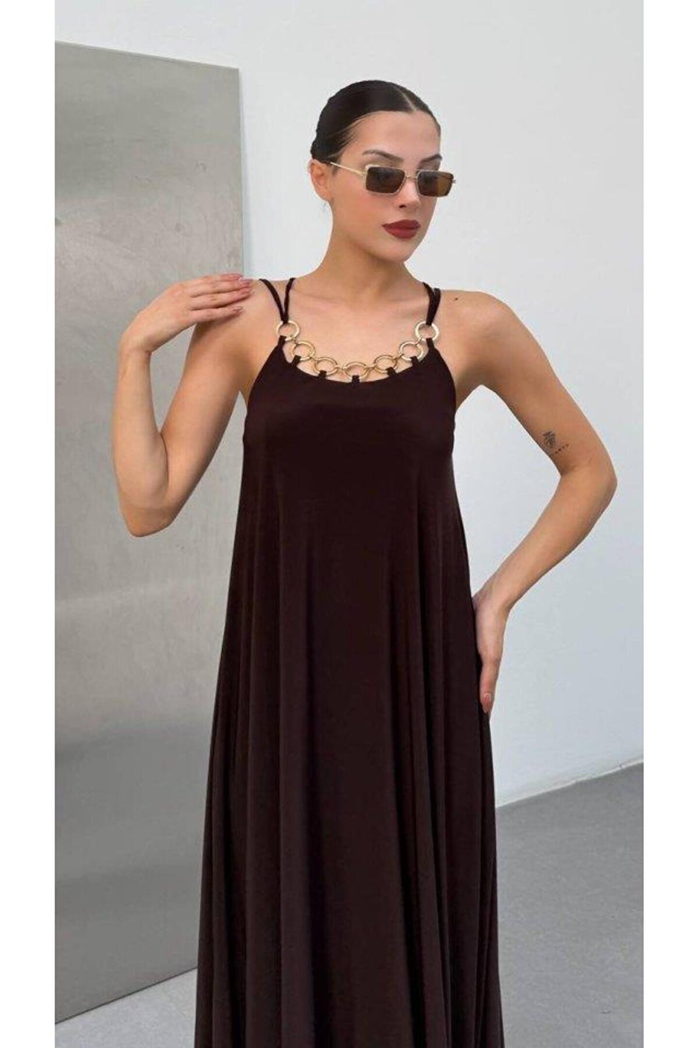 ESSE BUTİK Kadın Omuz Askılı Kuş Gözü Zincir Detay Sandy Kumaş Maxi Boy Elbise