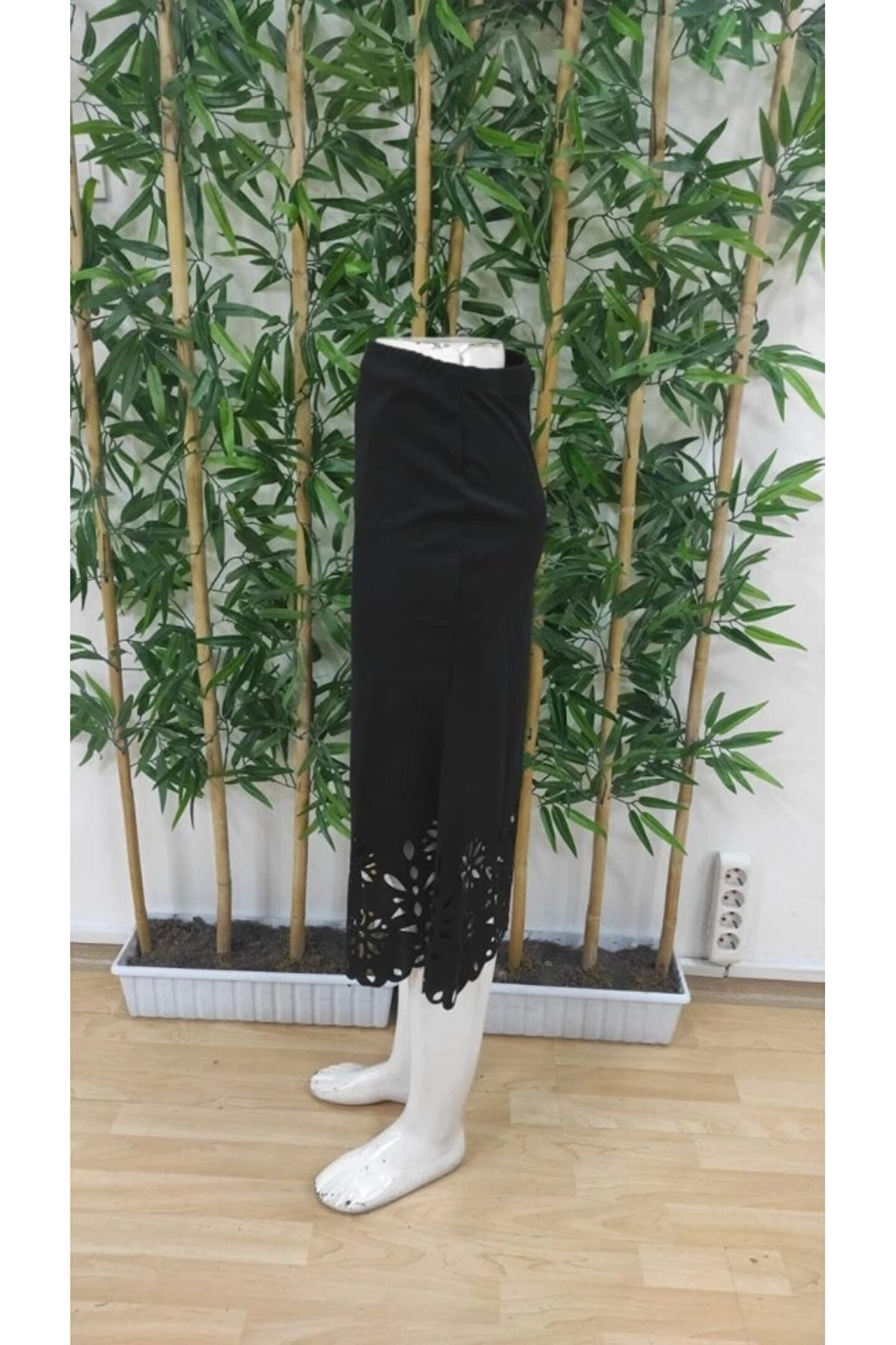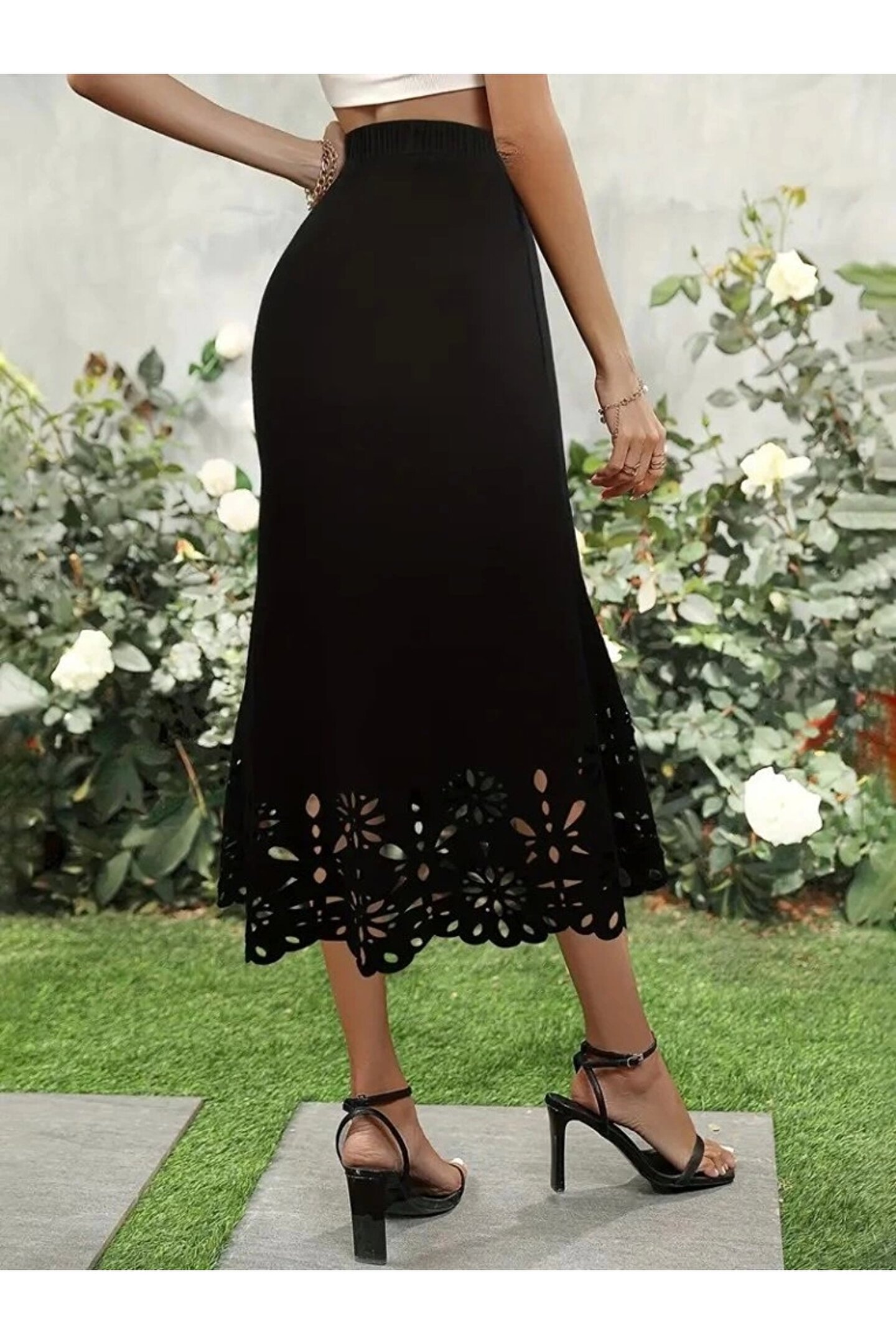ESSFASIHON Kadın Yüksek Bel Lazer Kesim Detaylı Midi Ithal Krep Etek