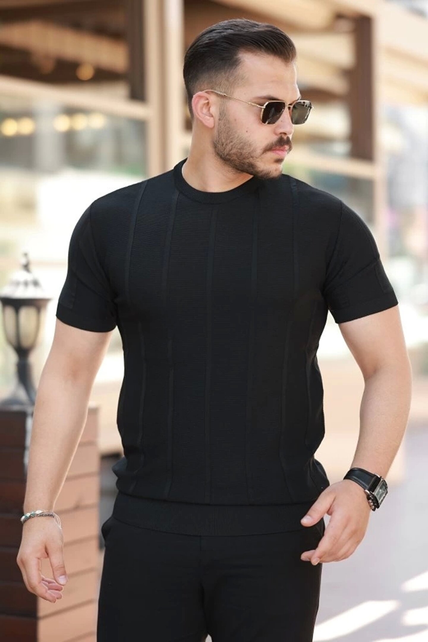 Erkek Desenli çizgi Kabartmalı Kısa Kollu Tişört