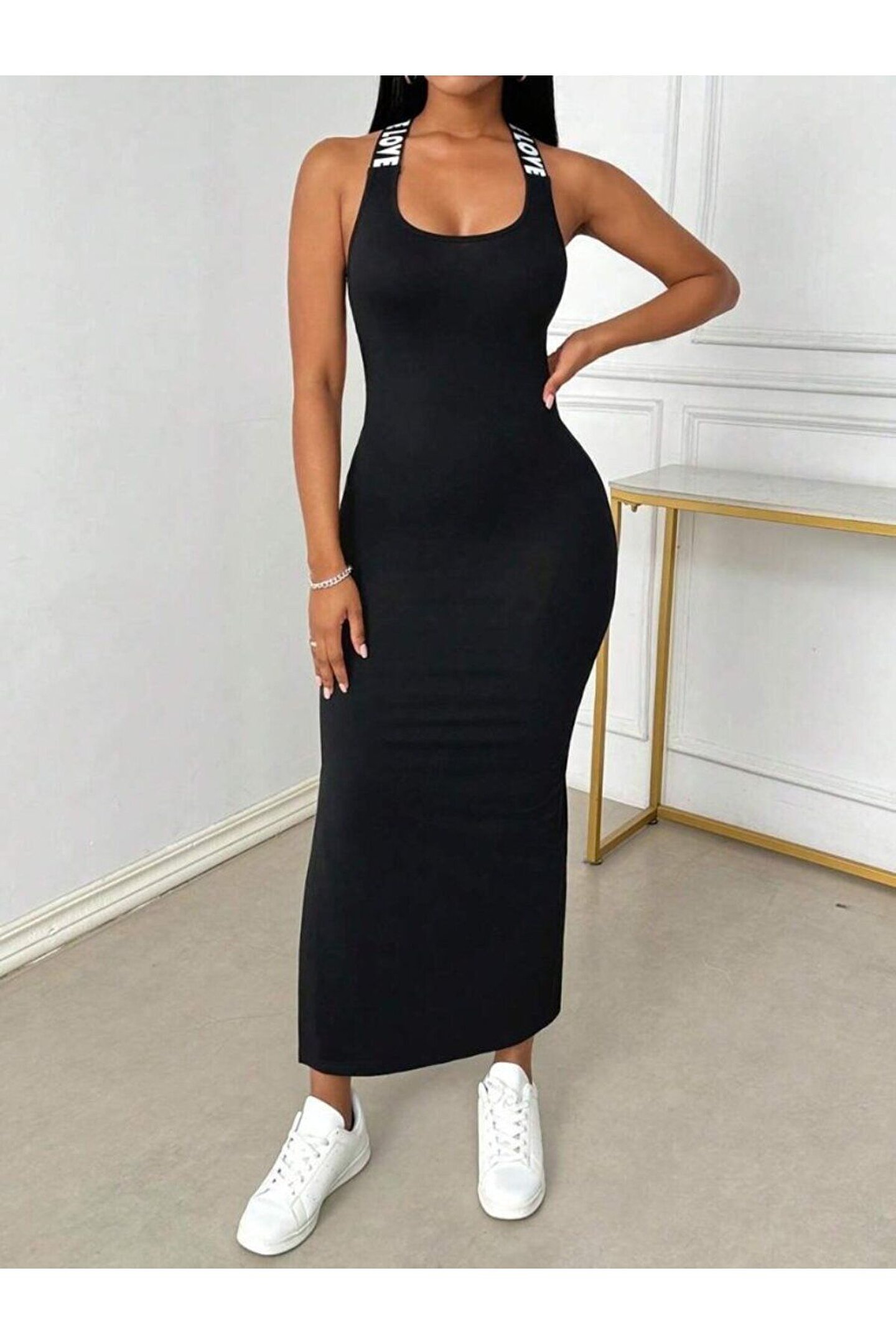 Moda Shop & Butik Kadın Yuvarlak Yaka Sırttan Çapraz Şerit Love Detaylı Yırtmaçlı Viskon Elbise