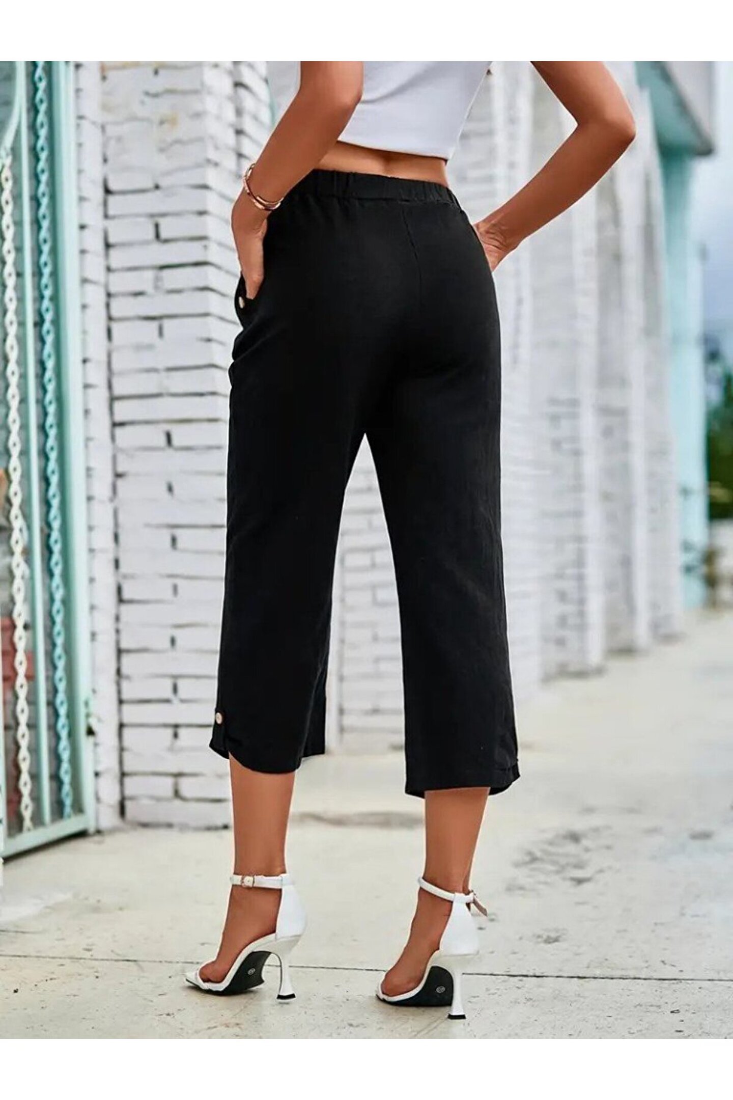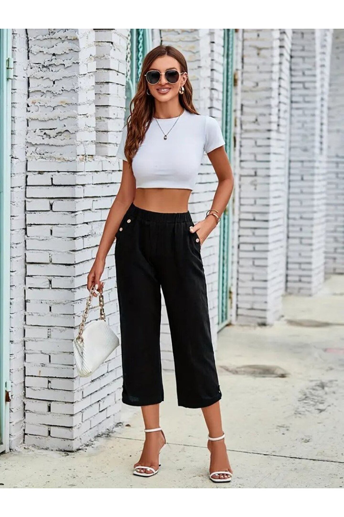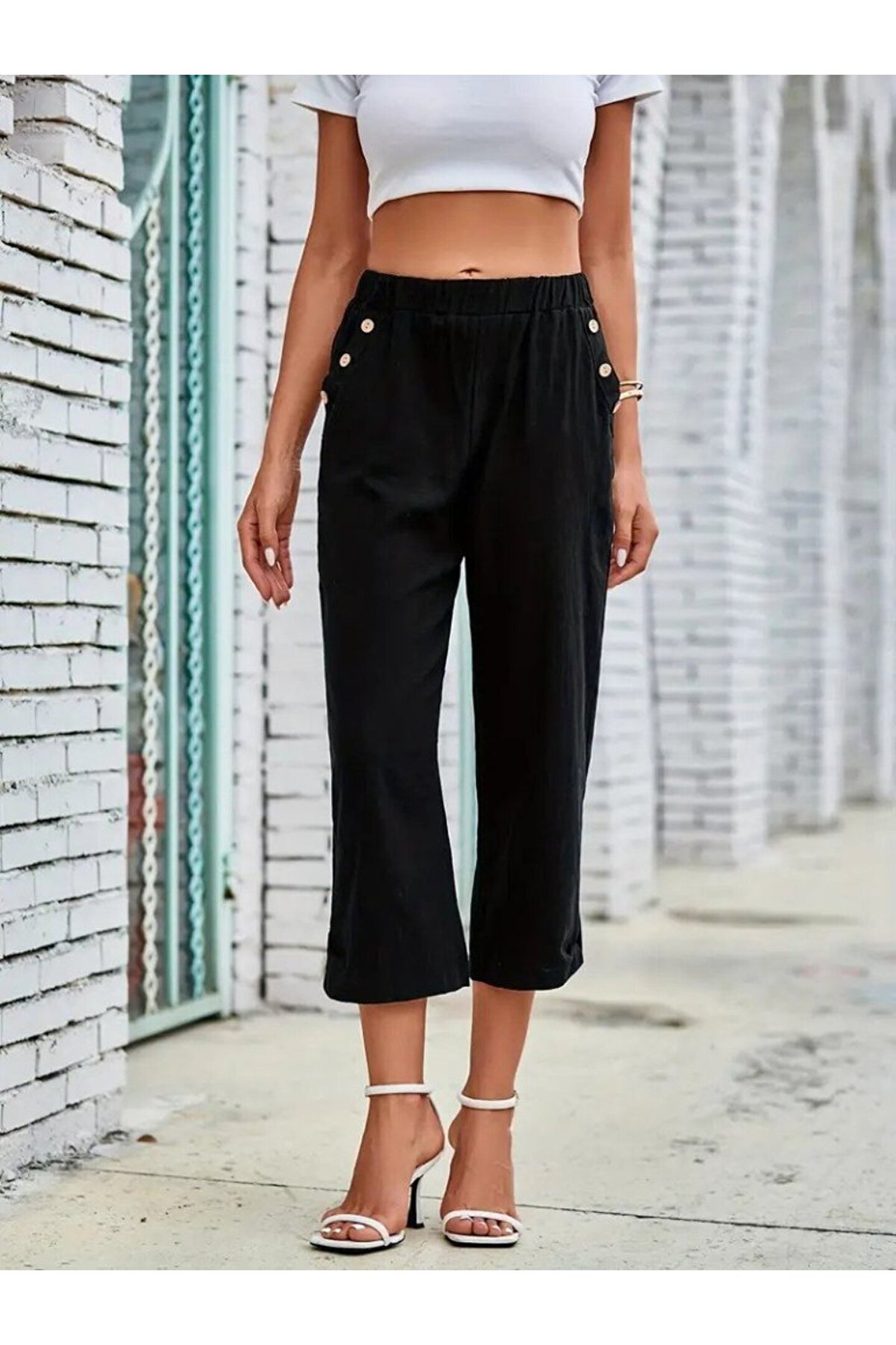 Kadın Beli Lastikli Düğme Ve Cep Detaylı Kapri Ithal Keten Pantolon