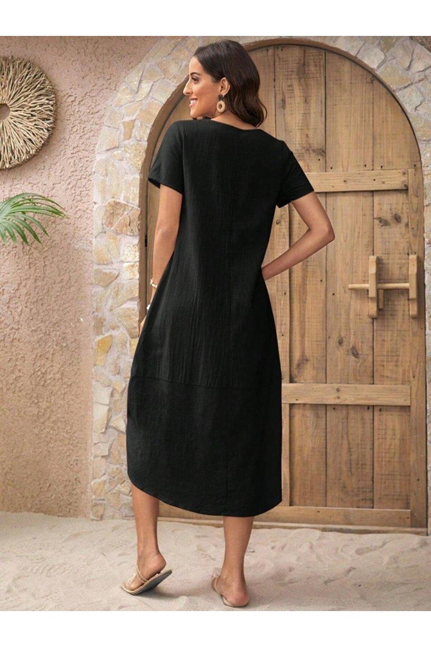 etol textile Kadın Kısa Kollu Bisiklet Yaka Düğme Detay Müslim Elbise