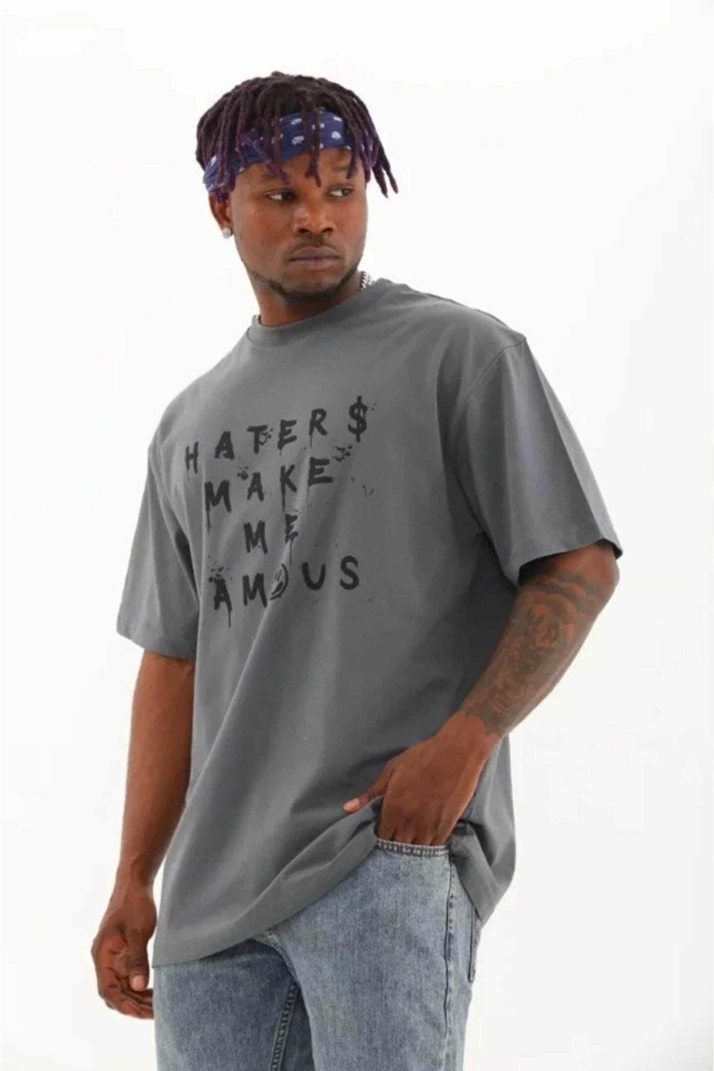 Unisex Oversize Baskılı Bisiklet Yaka T-Shirt - Füme