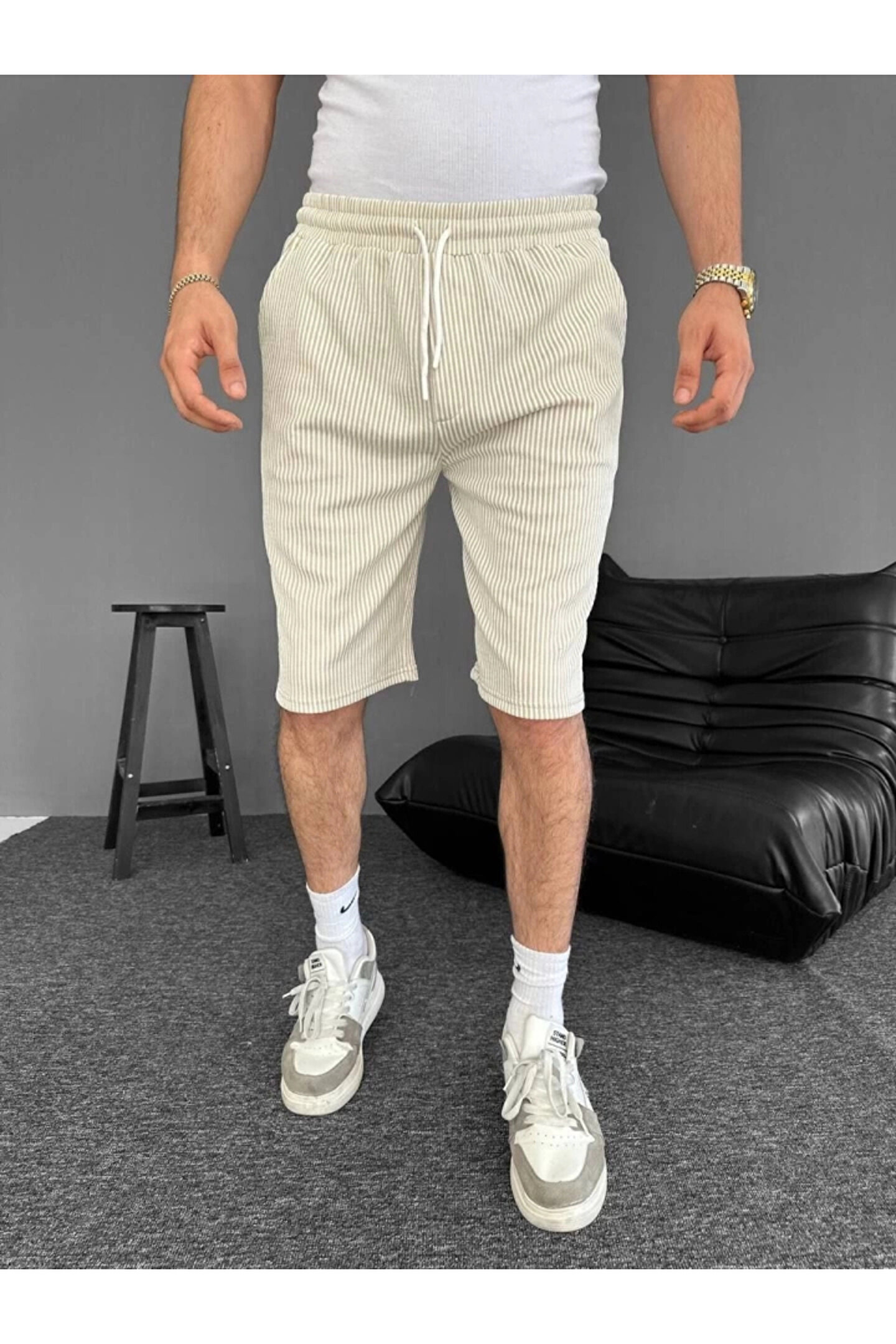 Su Yolu Çizgili Cepli Şort- Bej