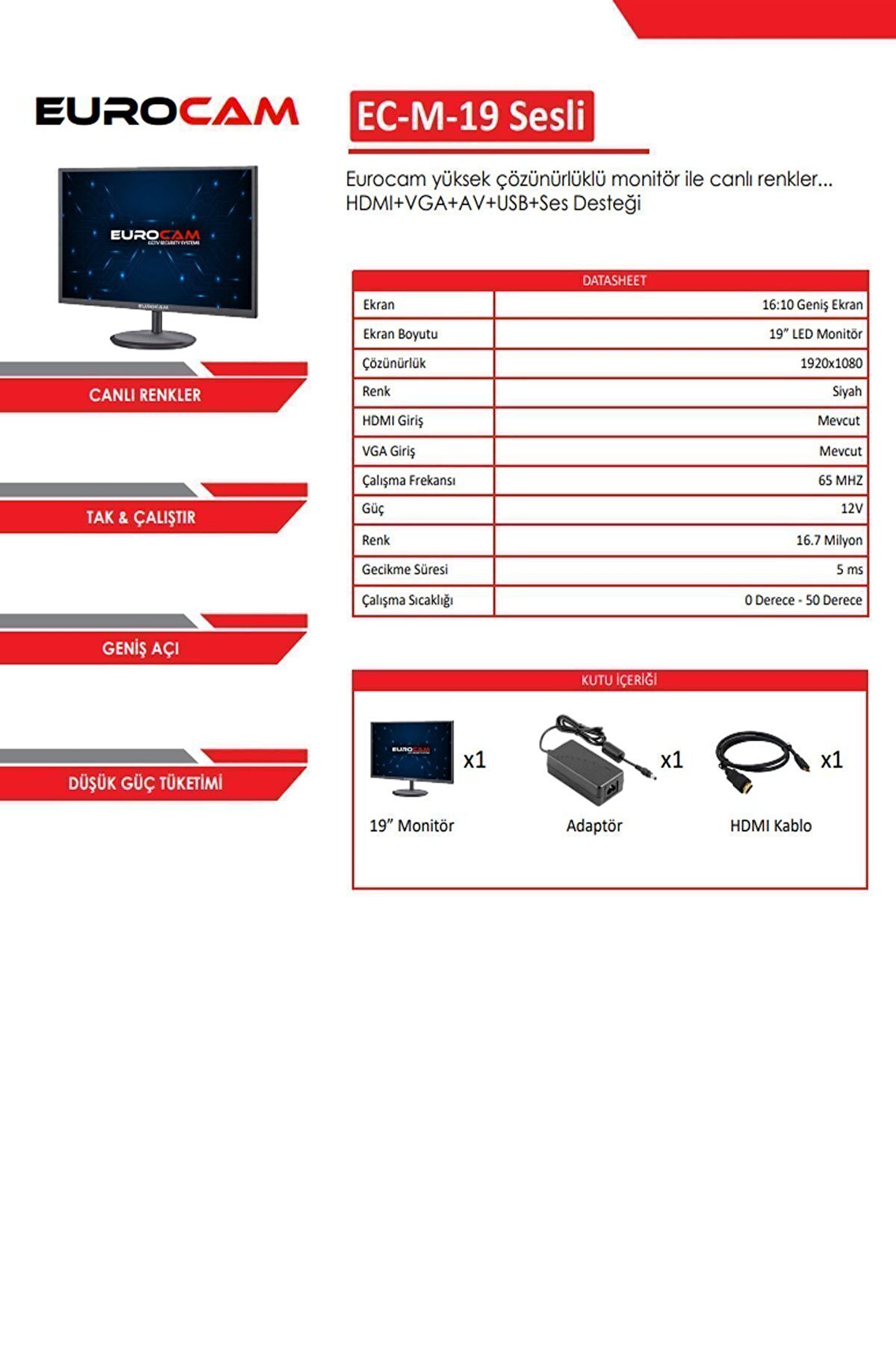 eurocam Ec-m19 19 65hz 0,5ms (HDMI VGA RCA SES) 1920 X 1080 Hd Lcd Monitör ( Dahili Hoparlör )