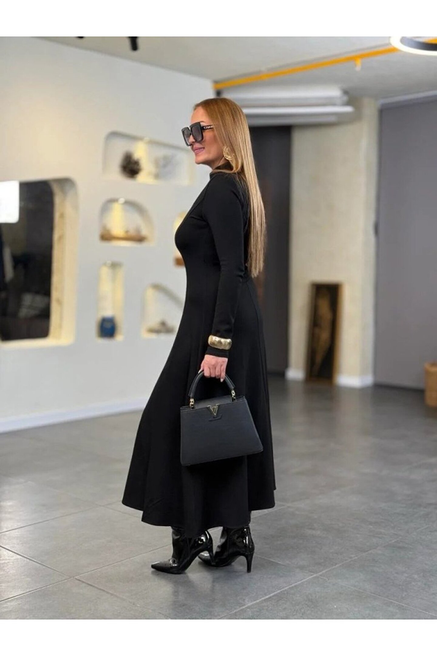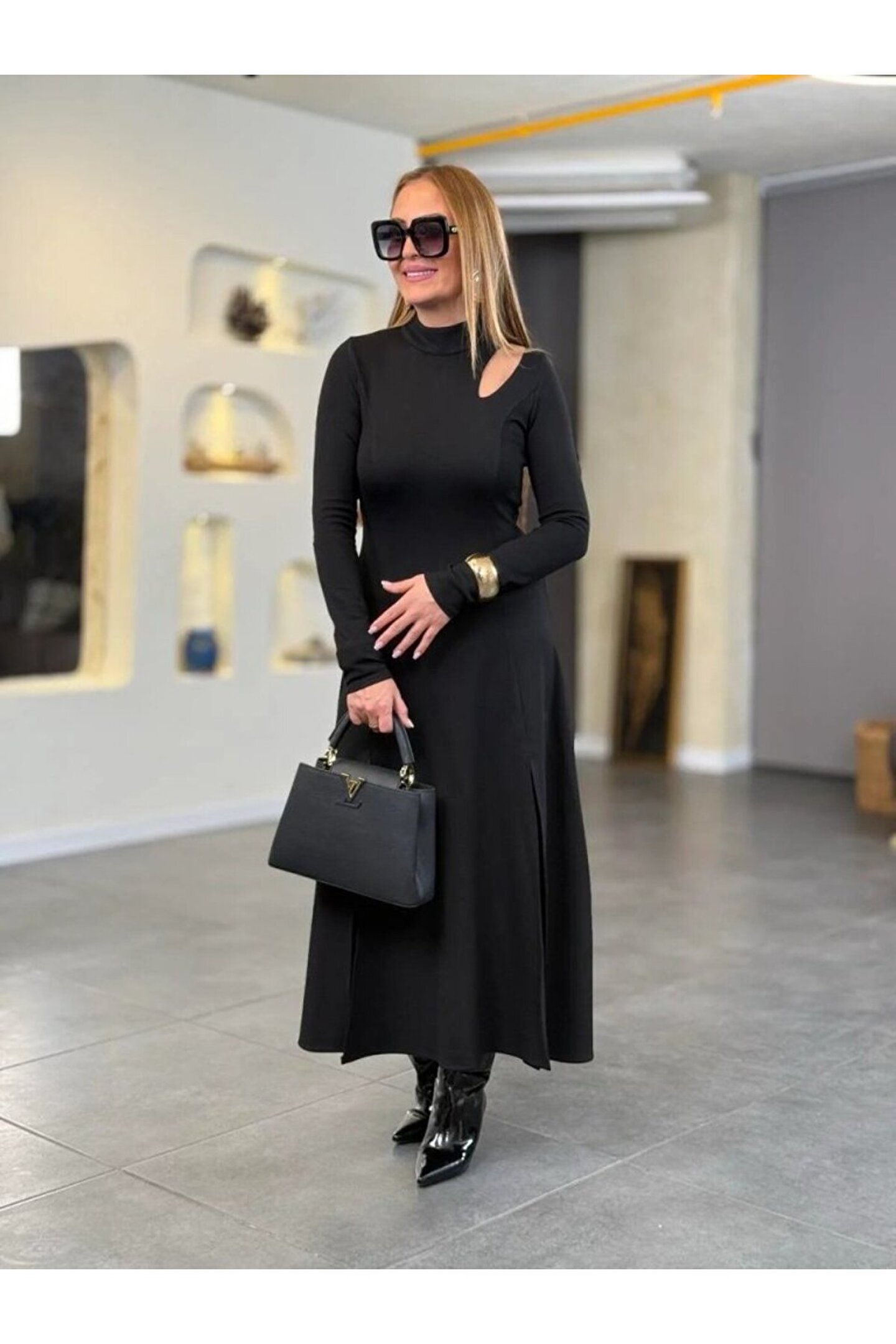 Evyora EQURİ Kadın Balıkçı Yaka Damla Detaylı Yırtmaçlı Uzun Viskon Iki Iplik Maxi Elbise