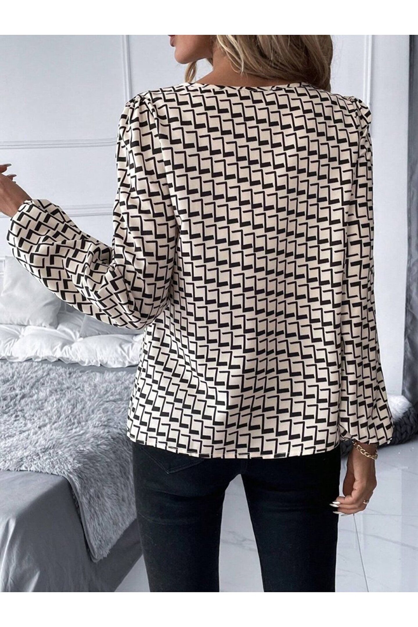 Evyora EQURİ Kadın Uzun Kollu Damla Detaylı Yaka Desenli Süprem Bluz
