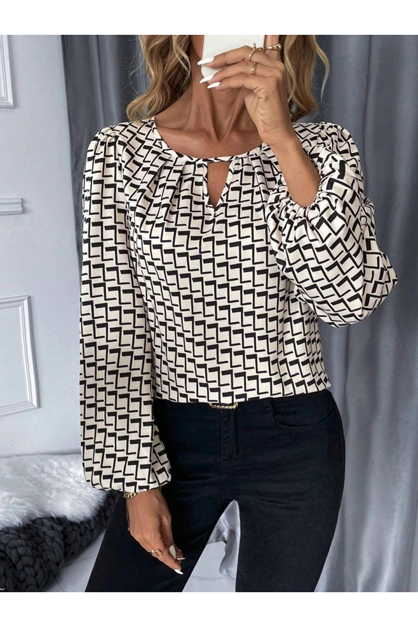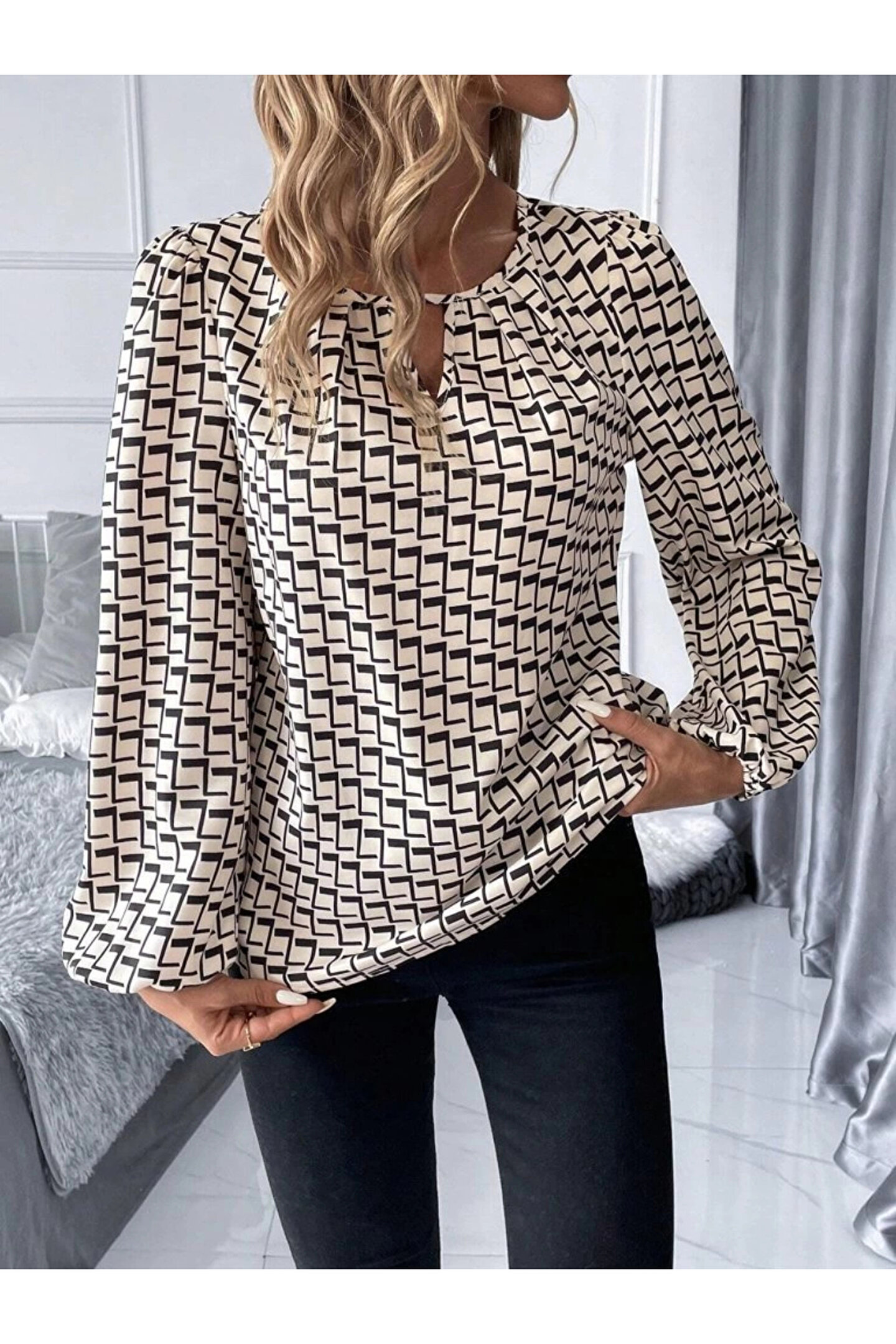 Kadın Uzun Kollu Damla Detaylı Yaka Desenli Süprem Bluz