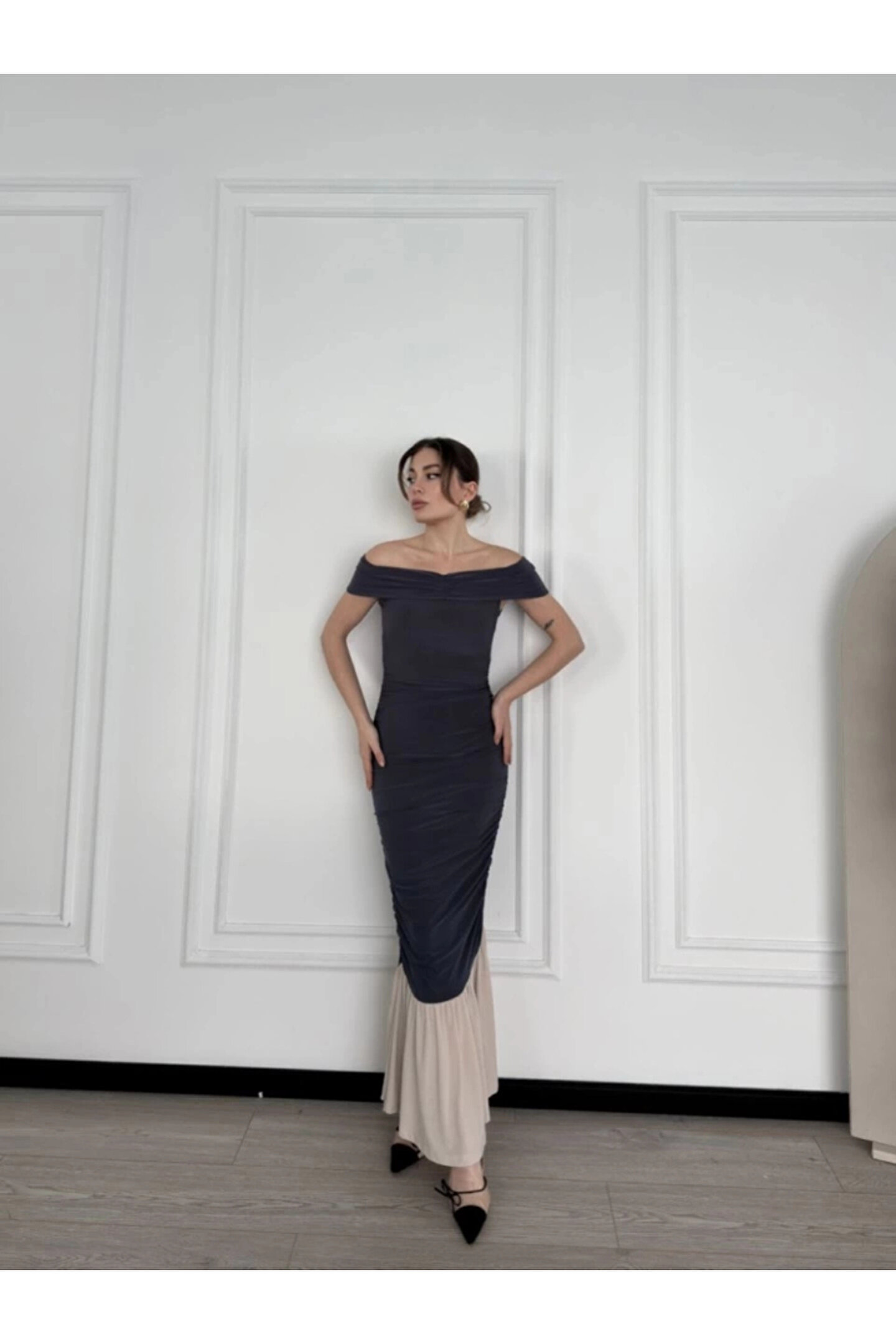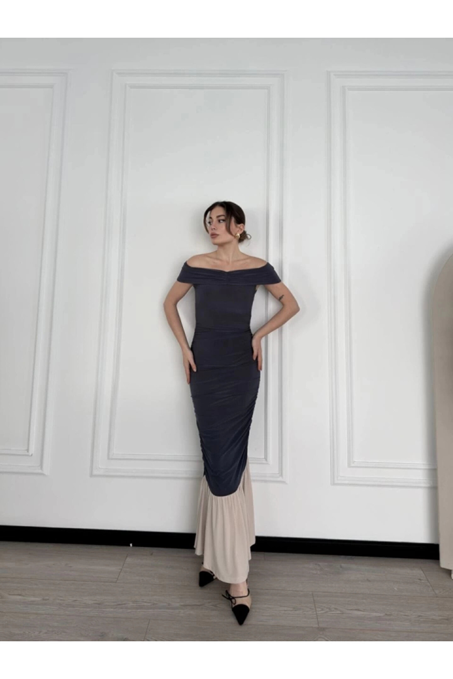 EYCAWEAR MDB triptiz Omuzlu Uzun Elbise Füme