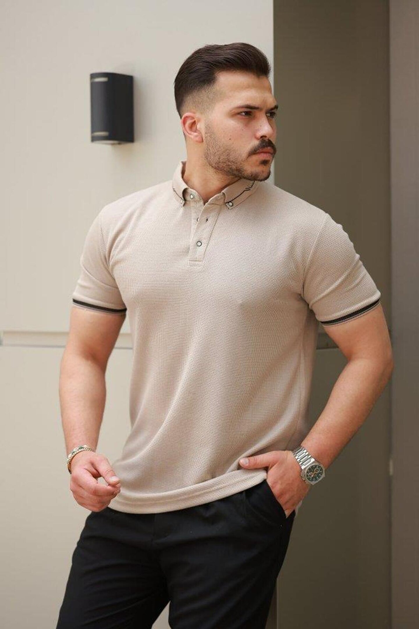 Erkek Düğmeli Yaka Waffle Kumaş Kısa Kollu Tişört