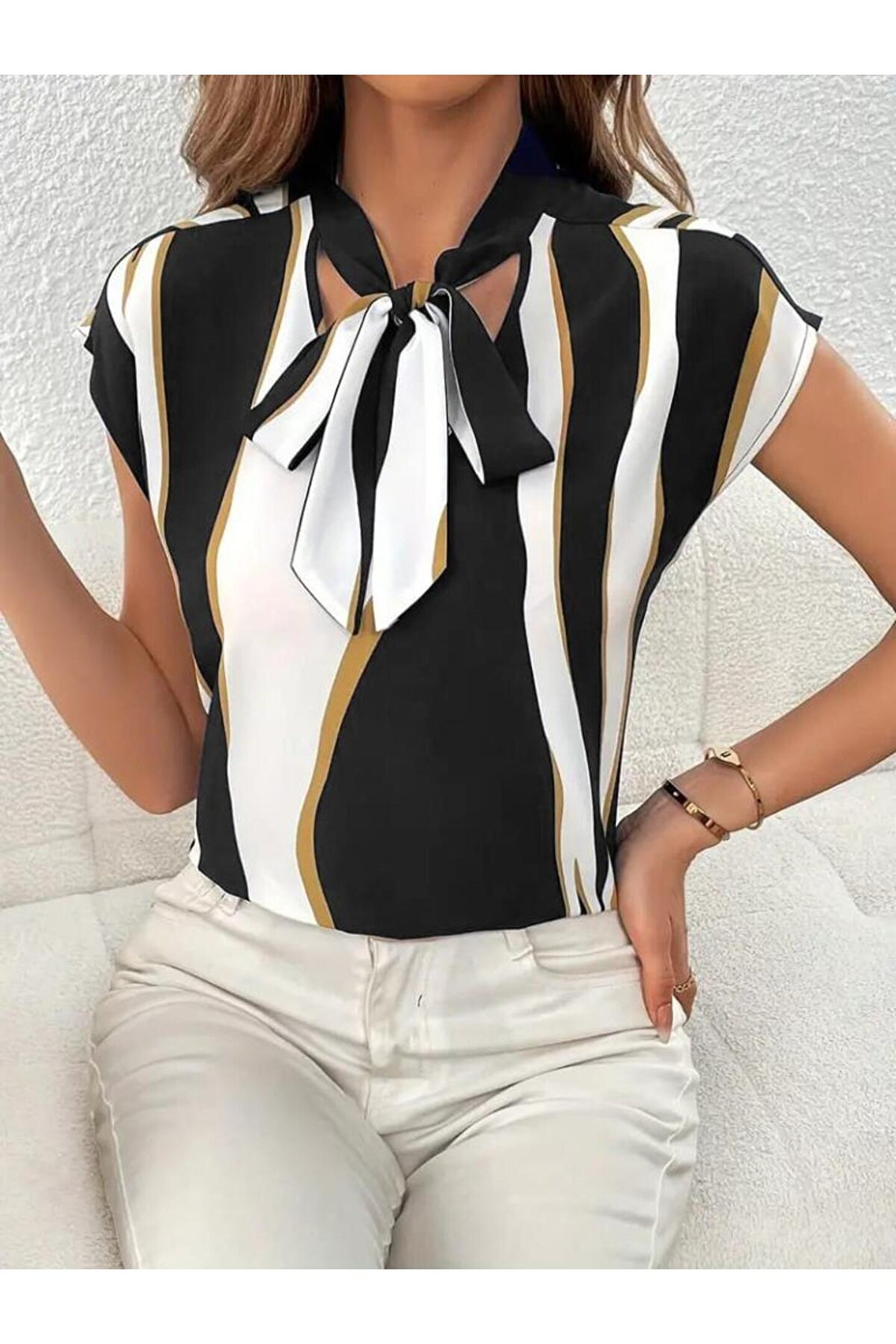 Kadın Kısa Kollu Boyundan Bağlamalı Desenli Dokuma Bluz