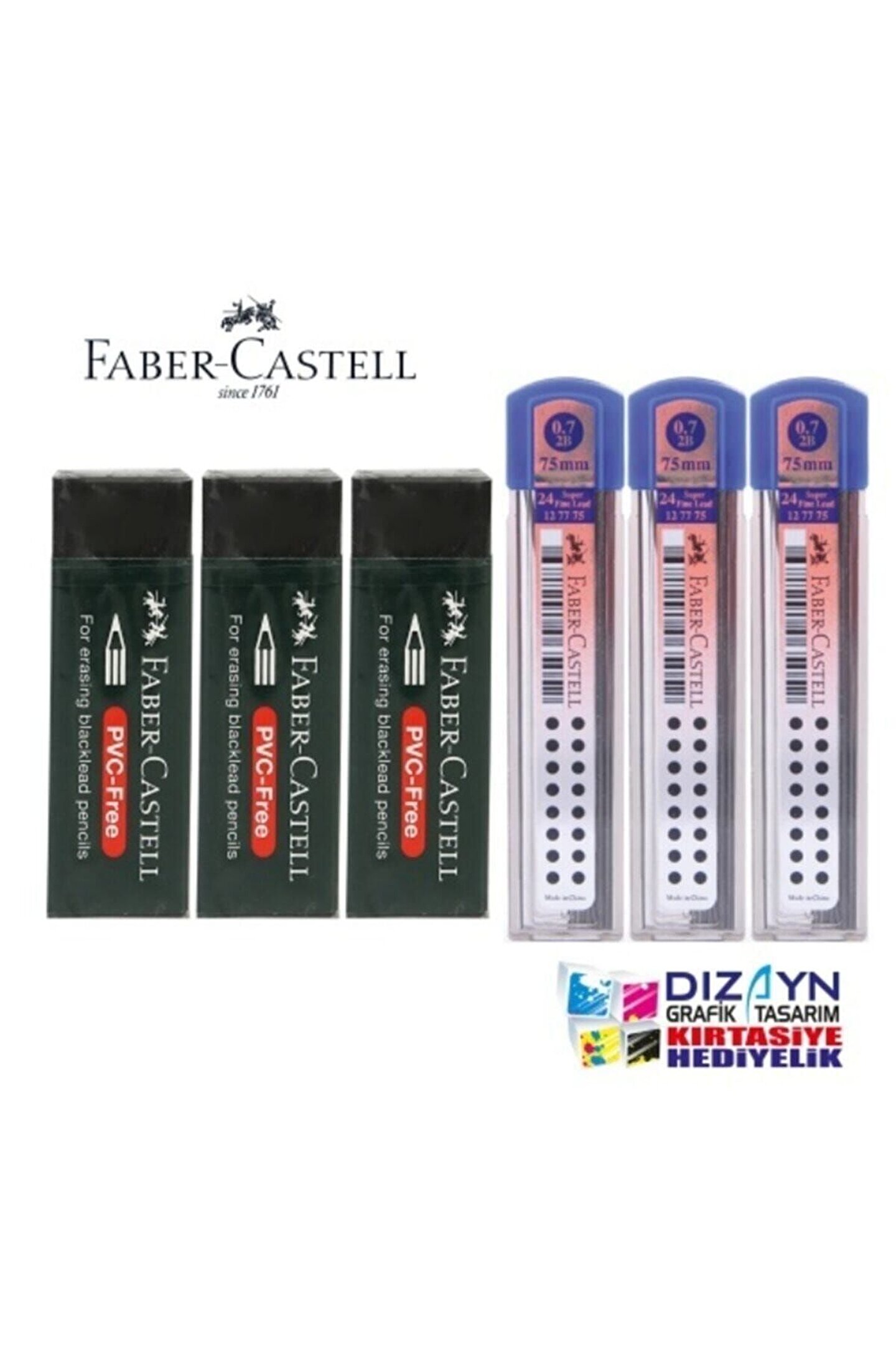 FABER CASTELL 3 ADET 0,7 MİN 2B + 3 ADET BÜYÜK SİYAH SİLGİ SET;