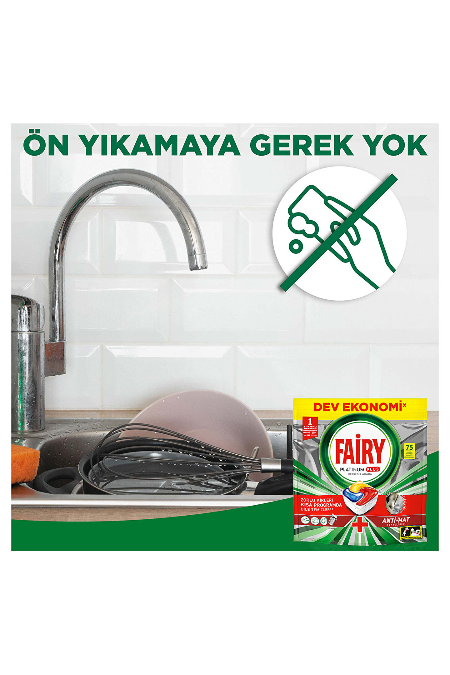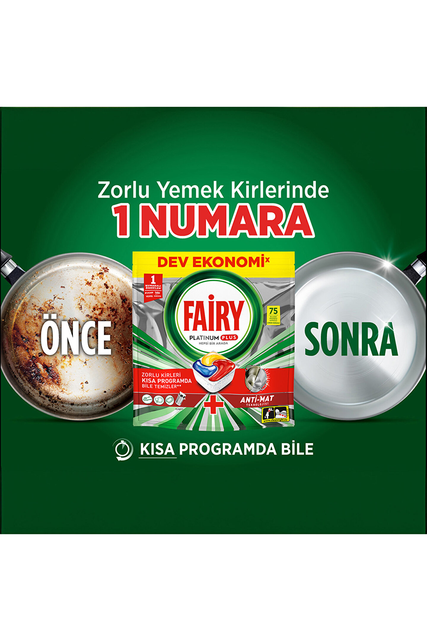 Yeni gibi tertemiz bulaşıklar için, Fairy Platinum Plus’ı deneyin.; Fairy Platinum Plus bulaşık makinesi kapsülleri sadece inatçı yemek kalıntılarını parçalamakla kalmaz, aynı zamanda, zamanla oluşan matlığı da gidermenize yardımcı olur ve böylece bulaşıklarınıza gerçek parlaklığını geri kazandırır.; Hepsi bir arada etkiye sahip Fairy Platinum Plus bulaşık makinesi kapsülleri düşük sıcaklıklarda bile hızlı çözünür.; Kısa programlı yıkamada kullanılabilir ve hepsi bir arada durulama yardımı ve tuz fonksiyonu, gümüş ve cam koruma ile birlikte sunulur.;