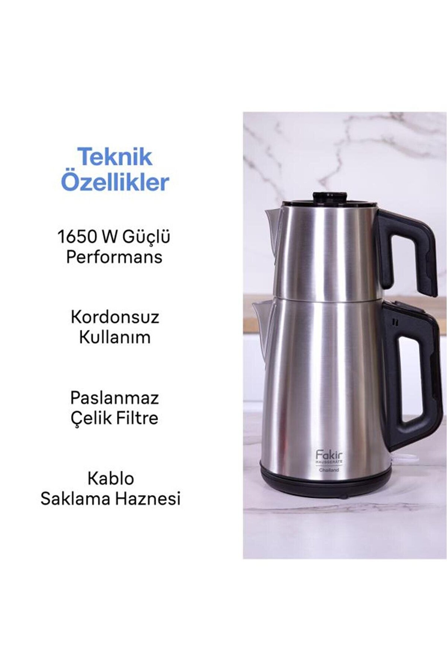 Gelişmiş susuz çalışmayı önleyen sistemi ile su seviyesi düştüğünde otomatik olarak kendini kapatan Chailand Çay Makinesi; size güvenli bir kullanım sunar. 1.3 L yüksek kapasiteli demliği ile kalabalık misafir gruplarınızla bile taptaze çay keyfini çıkarabilirsiniz.
