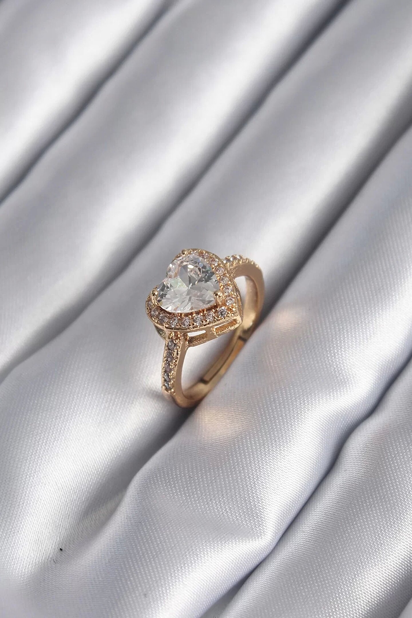 Pirinç Gold Renk Zirkon Taşlı Kalp Charm Model Kadın Yüzük