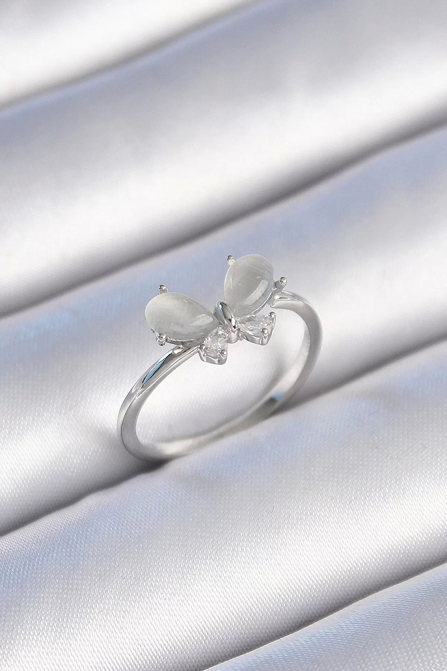 Pirinç Gümüş Renk Zirkon Taşlı Beyaz Mineli Kelebek Model Kadın Yüzük