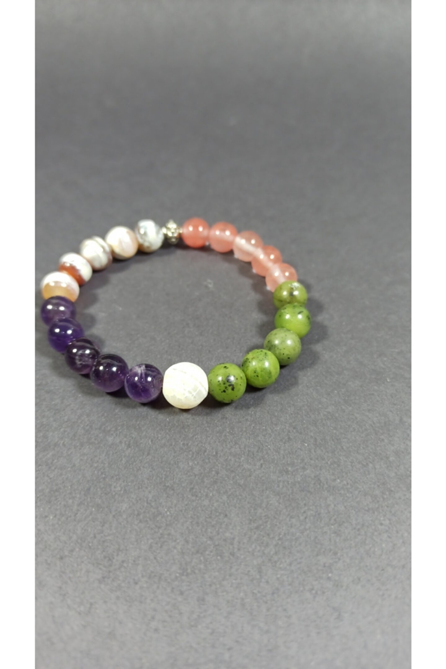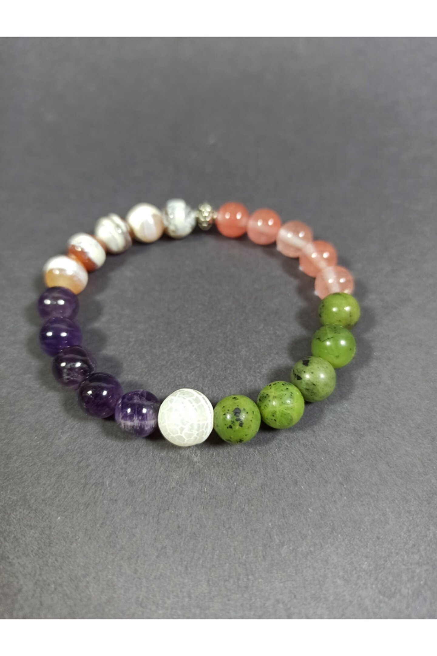 Ametist, gül kuvars, yeşim taşı ve akik taşlı süper uyumlu cakra bileklikler.Taslar yüzde 100 doğal taslardir.esnek ipi sayesinde her bileğe uygundur.taslar 8 mm boyutlarında,sadece ortadaki beyaz yengeç akik 10 mm şeklindedir.