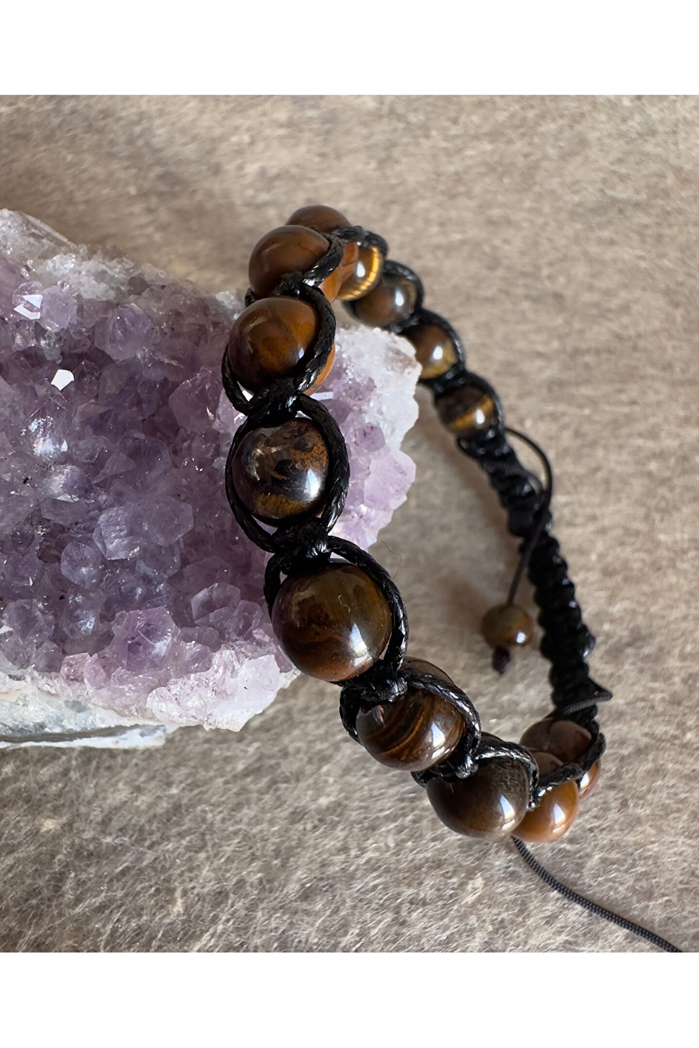 8 mm orijinal kaplan gözü taşlar ve deri örme ipi kullanılmıştır.; Asansör tipi kapaması sayesinde her bileğe uygundur.
