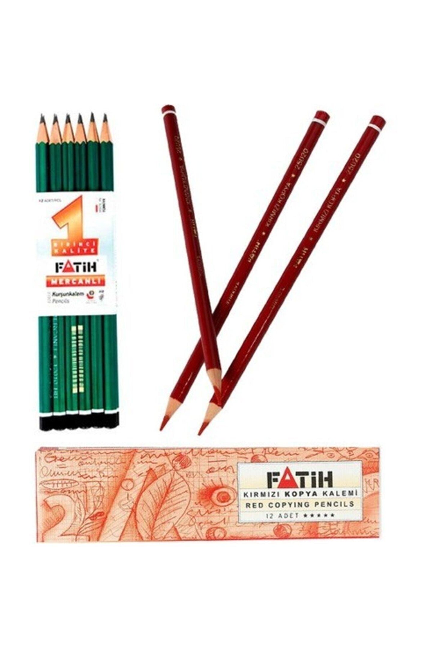 Fatih mercanlı kurşun 12'li + kırmızı kopya kalemi 12'li fati?h kalem paket i?çeri?ği? fati?h mercanli kurşun kalem 12 adet fati?h kirmizi kopya kalem 12 adet ürün özelli?kleri? • yüksek kaliteli mine• çok amaçlı kullanım • uç kırılmasına karşı direnci arttıran özel yapıştırma sistemi • kolay açılır.; • 12 li paket;