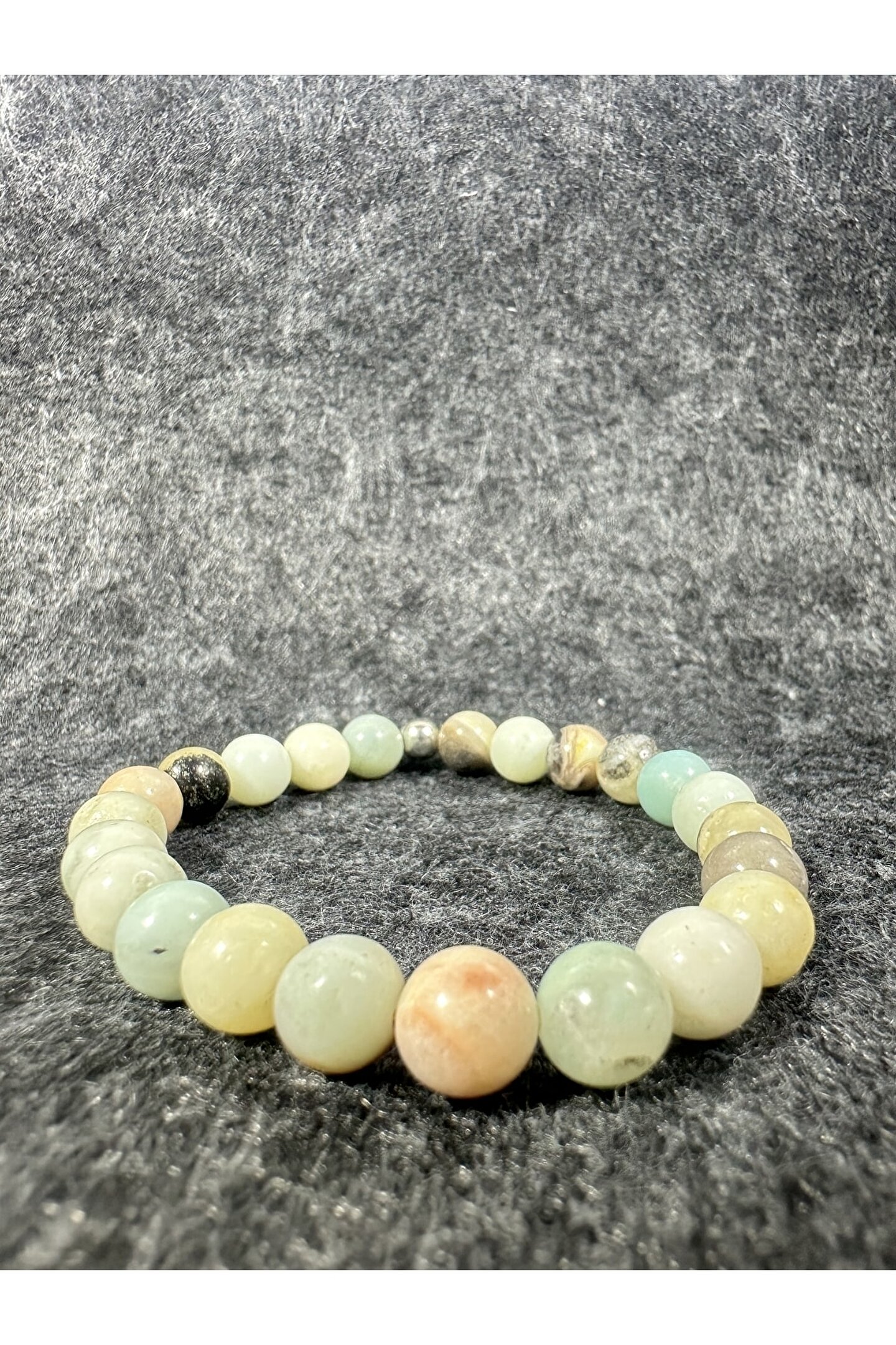 Doğal taş bileklik, her bir bileklikte bulunan benzersiz desen ve renklerle doğanın zarafetini yansıtır; Amazonit taşı, bileklikte kullanılan ana malzeme olarak seçilmiştir ve bu sayede hem şıklığı hem de doğallığı bir arada sunar; Bu bileklik, günlük kullanım için idealdir ve her türlü kıyafetle kolayca uyum sağlar; Doğal taş bileklik, el yapımı olmasıyla dikkat çeker ve her bir parça benzersiz bir hikaye anlatır; Amazonit taşı, bileklikte kullanılan diğer malzemelerle uyumlu bir şekilde birleşerek estetik bir görünüm oluşturur;