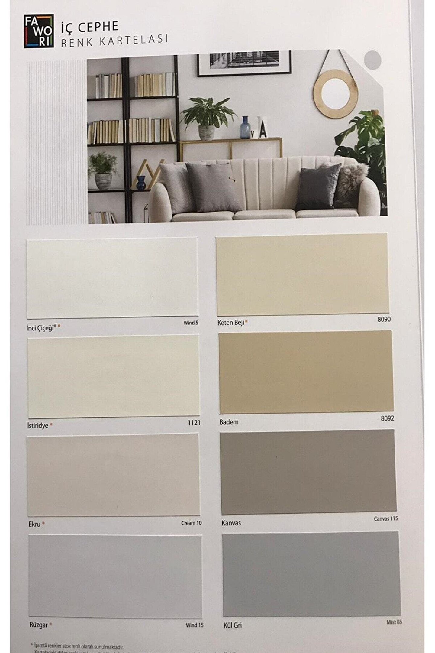 Fawori Plastik İç Cephe Duvar Boyası Tüm Renk Seçenekleri FAWORİMİX İle Aynı Gün Üretilir; Hazırlanan Renklerde İade ve Değişim Yapılmaz; FAWORİ BOYA FİLLİ BOYA ÜRÜNÜDÜR Özellikler Fawori plastik boya, su kaldırır yapıda ve yüksek örtücülüğünün yanısıra silinebilme özelliğine sahip bir boyadır; Uygulandığı yüzey ile bütünleşir; Yüksek teneffüs kabiliyetine sahiptir; Yapı malzeme standartlarına uygun uygulama yapıldığında çatlama, kabarma ve dökülme yapmaz; Su bazlı olması nedeni ile rahatsız edici bir kokusu yoktur, çevre dostudur; BOYALARIMIZ RENK MAKINAMIZDAN SİPARİŞİNİZE ÖZEL HAZIRLANDIGI İÇİN ( " İsteğiniz ile size özel olarak üretilen veya üzerinden değişiklik ya da ilave yapılarak size özel hale getirilen ürünler " Maddesine göre ) CAYMA HAKKI KAPSAMI DISINDADIR ÜRÜN TANIMI Akrilik kopolimer emülsiyon esaslı, mat görünümlü, dekoratif iç yüzey plastik boyasıdır; ÖZELLİKLERİ Fawori İç Cephe Plastik Boya, ekonomi ve kaliteyi bir arada verir; Mat ve pürüzsüz görünüşlüdür; Su kaldırır yapıda, yüksek nefes alma özelliğine sahiptir; Yüzeylere mükemmel yapışır; Yapı malzeme standartlarına uygun uygulama yapıldığında çatlama, kabarma ve dökülme yapmaz; Su bazlı olması sebebiyle rahatsız edici bir kokusu yoktur, çevre dostudur; İNCELTME Fırça ve rulo uygulamalarında temiz su ile %20 inceltilerek iki kat halinde uygulanması tavsiye edilir; Havasız (airless) püskürtmede, temiz su ile %10; 15 inceltilerek yeterli film kalınlığı sağlanmak kaydıyla tek kat uygulanabilir; SARFİYAT Uygulama yapılacak yüzeyin cinsine, emiciliğine ve yapısına göre 1 Kilogram ile tek katta 7; 11 m 2 alan boyanabilir; Kesin sarfiyat için kontrollü numune çalışması yapılmalıdır;