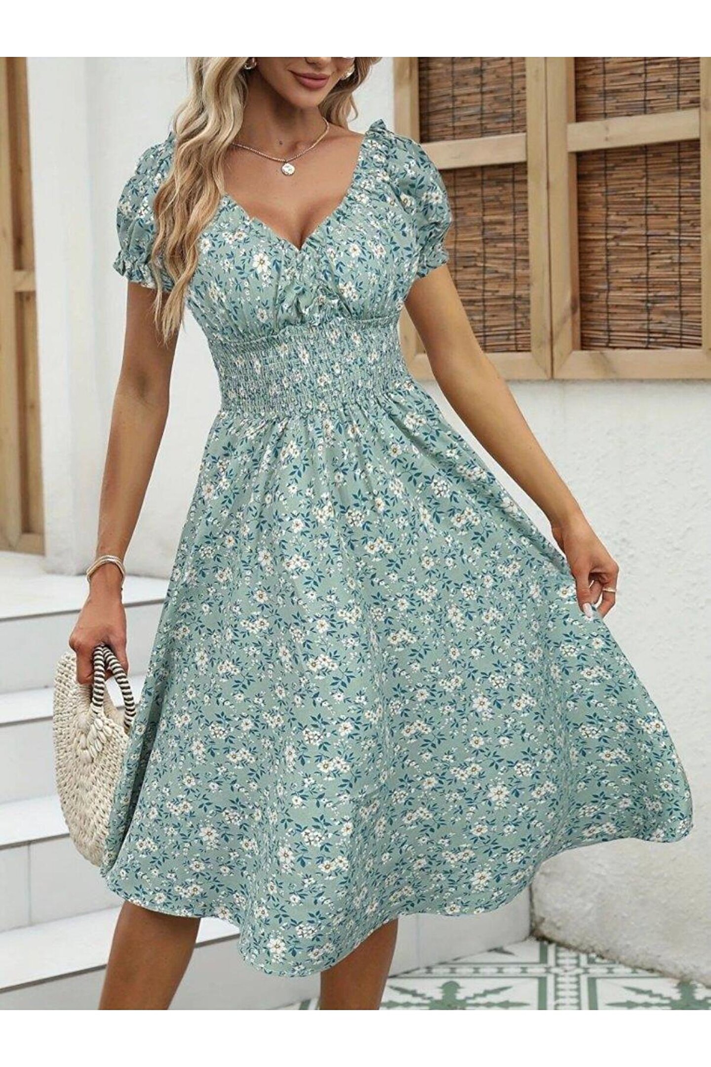 Kadın Kısa Kollu Kruvaze Yaka Lastikli Belden Gipeli çiçek Desenli Suprem Elbise