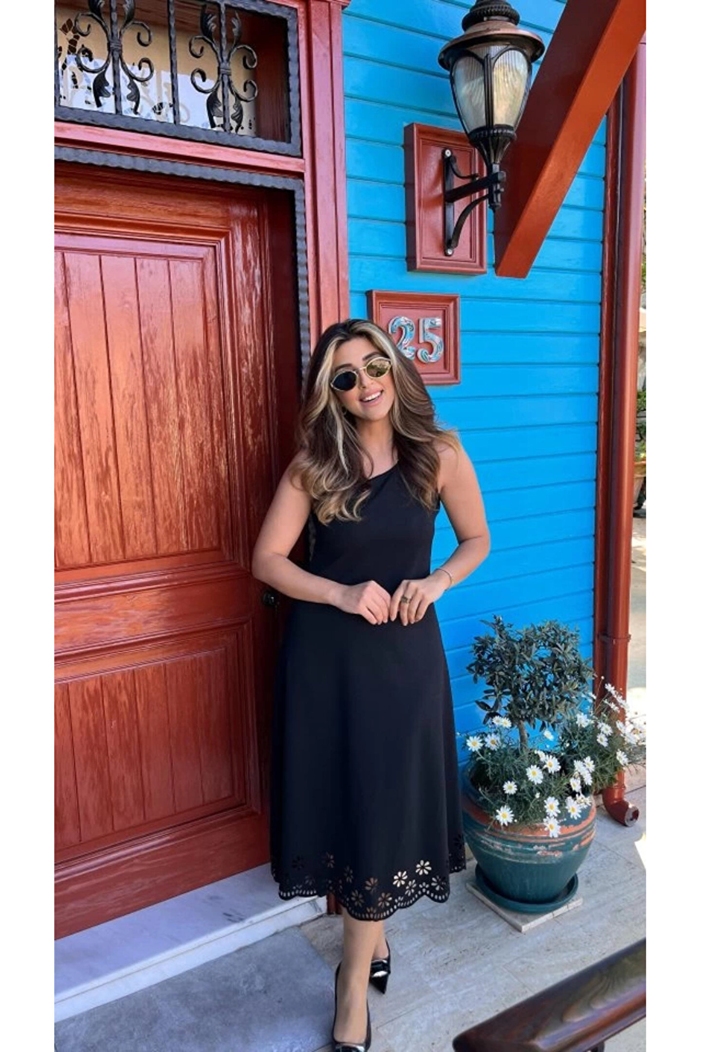 Faylora MDB Kadın Kolsuz Etek Ucu Lazer Kesim çiçek Desenli Midi Boy Janjan Krep Elbise