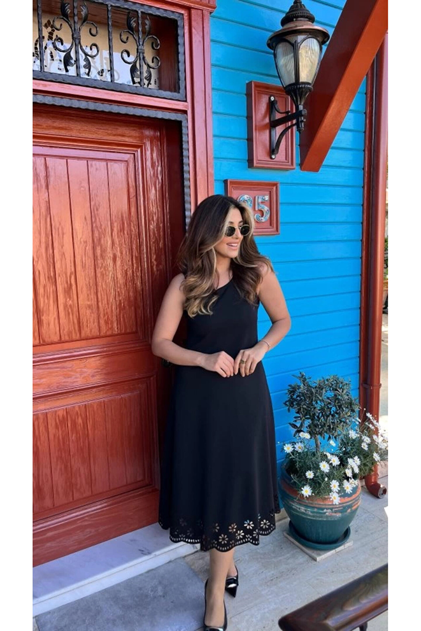 Faylora MDB Kadın Kolsuz Etek Ucu Lazer Kesim çiçek Desenli Midi Boy Janjan Krep Elbise