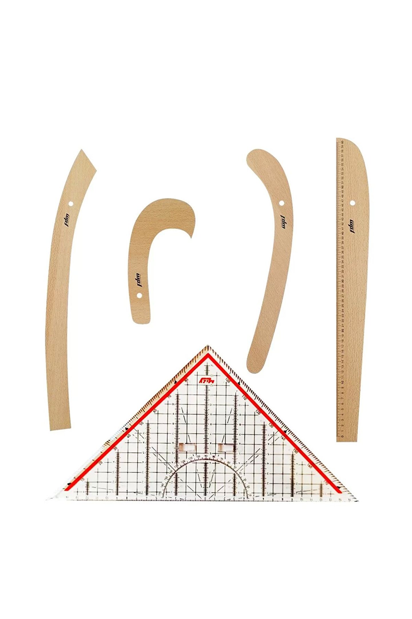 FDM 5 Parça Set - 4 Parça Ahşap Riga Seti Ve Modelist Gönyesi - Riga Takımı - Dikiş Seti Cetvel