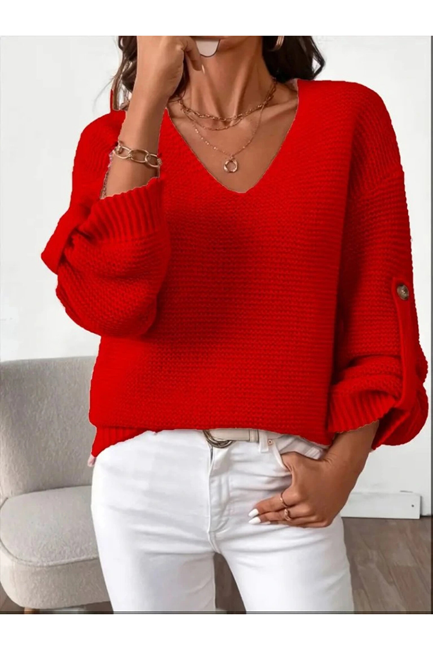 Femella Women Fashion Kadın Uzun Kollu V Yakalı Düğmeli Triko Bluz