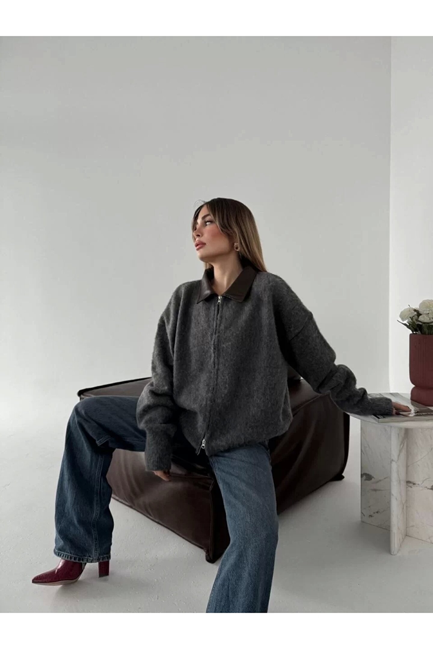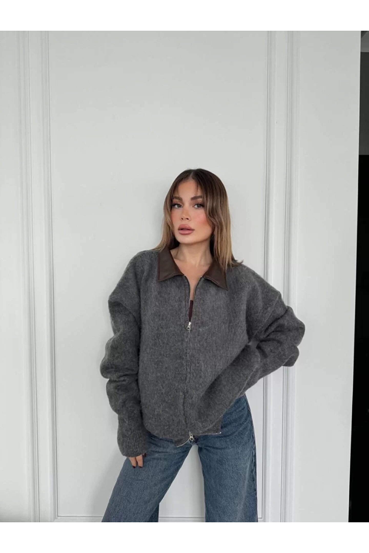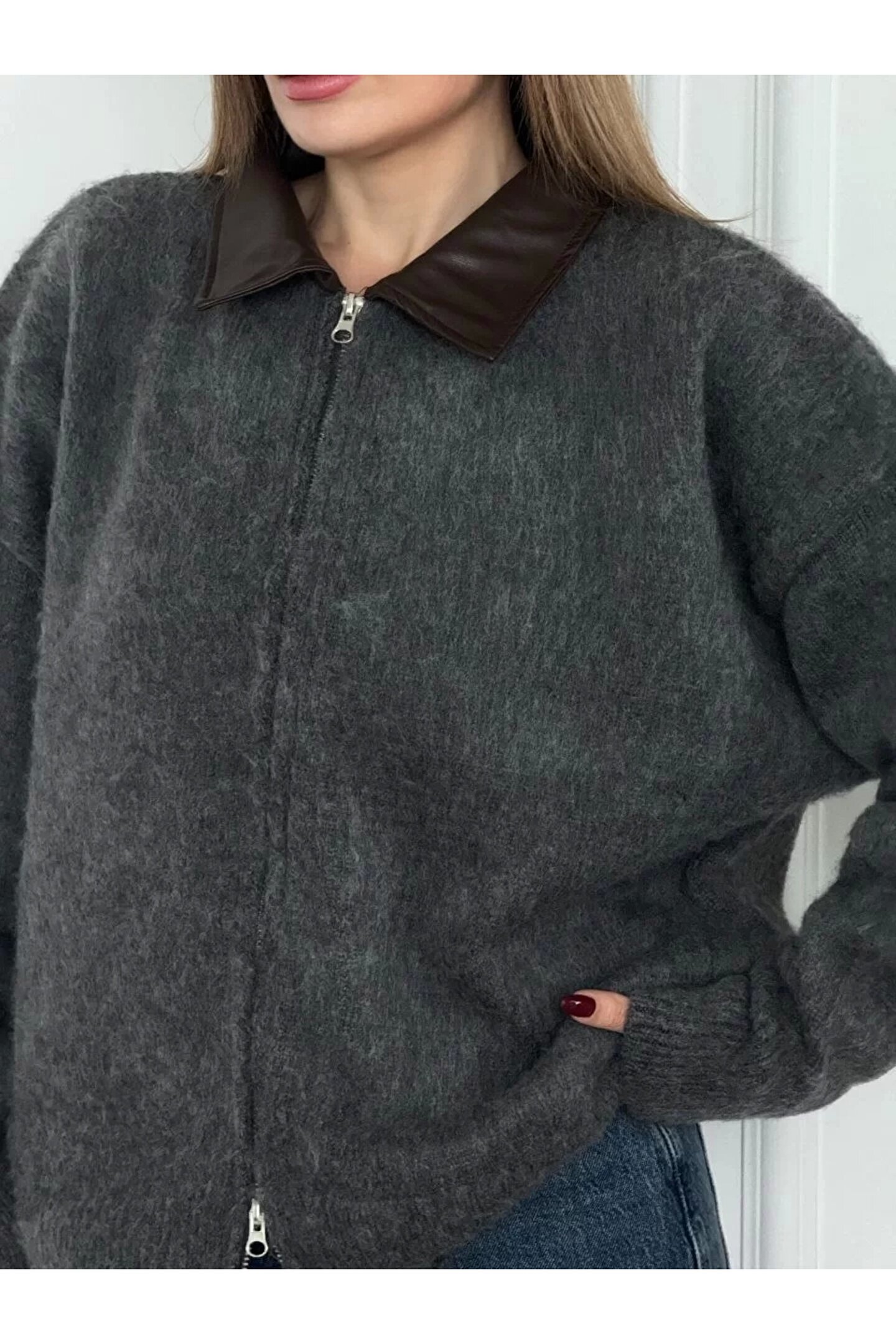 FENVORA Deri Yakalı Pamuk dokulu Çift Taraflı Çalışan Fermuar Ceket - Füme