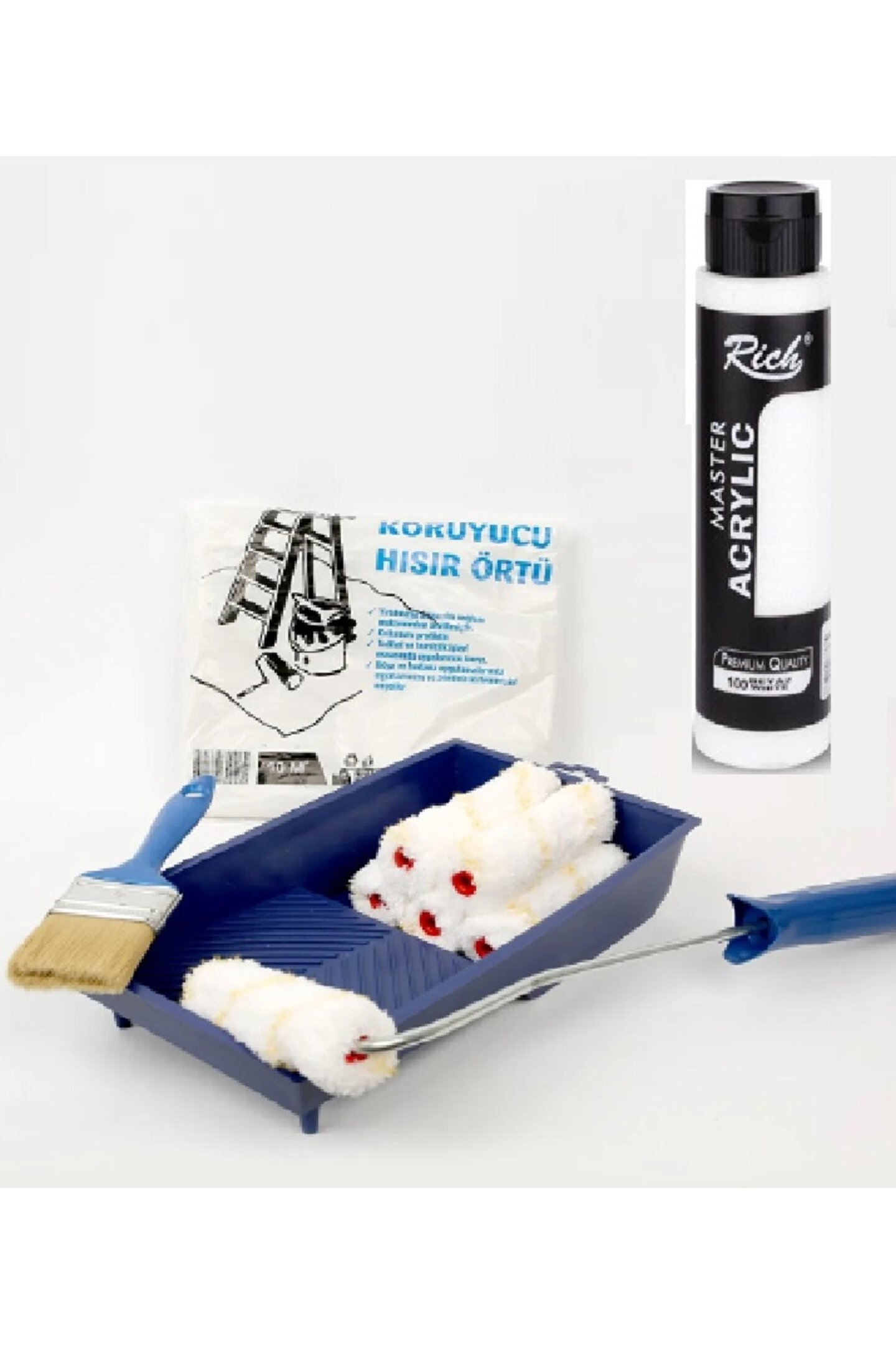 FırsatYapıMarket Akrilik Boyama Seti Beyaz 500 Cc Boya Rulo Fırça 5 Yedek Rulo Koruyucu Örtü Boya Kabı Boya Fırçası