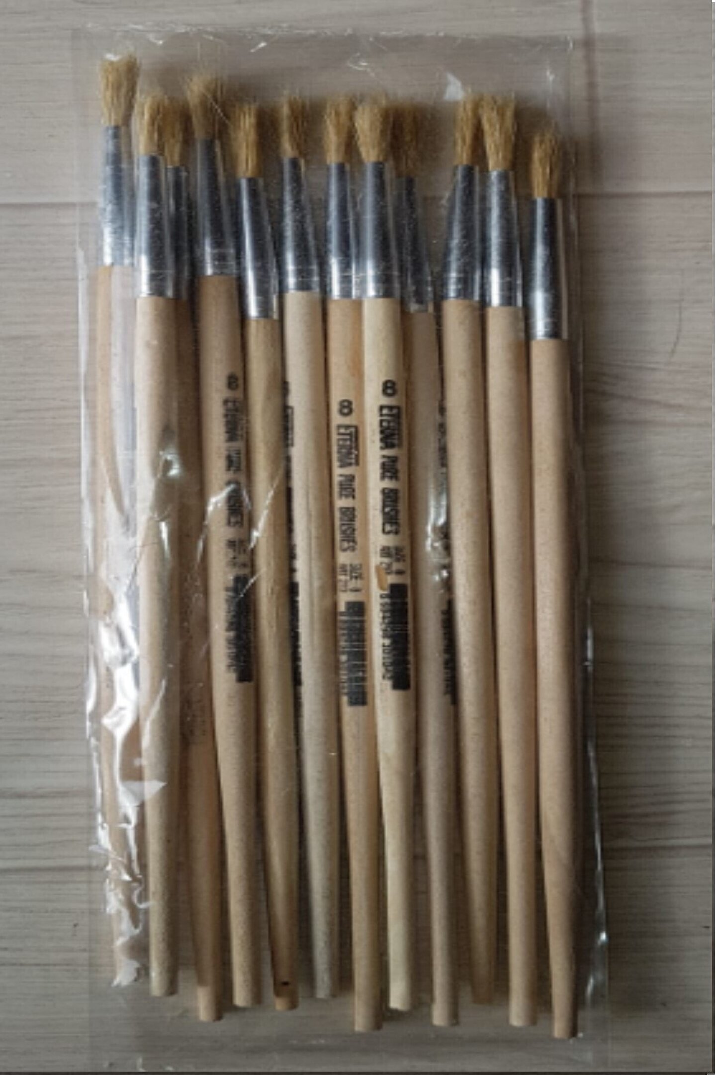 NO:8 12 ADET HOBİ SANAT FIRÇASI Kaliteli %100 doğal beyaz kıldan üretilmiştir. ; Yağlı boya, akrilik boya, suluboya, guaj boya, kumaş boyası, cam boyası ve porselen boyası için idealdir. ; Fırça kılı ile doğal uzun ahşap sapı birleştiren kısım alüminyumdan yapılmıştır.;