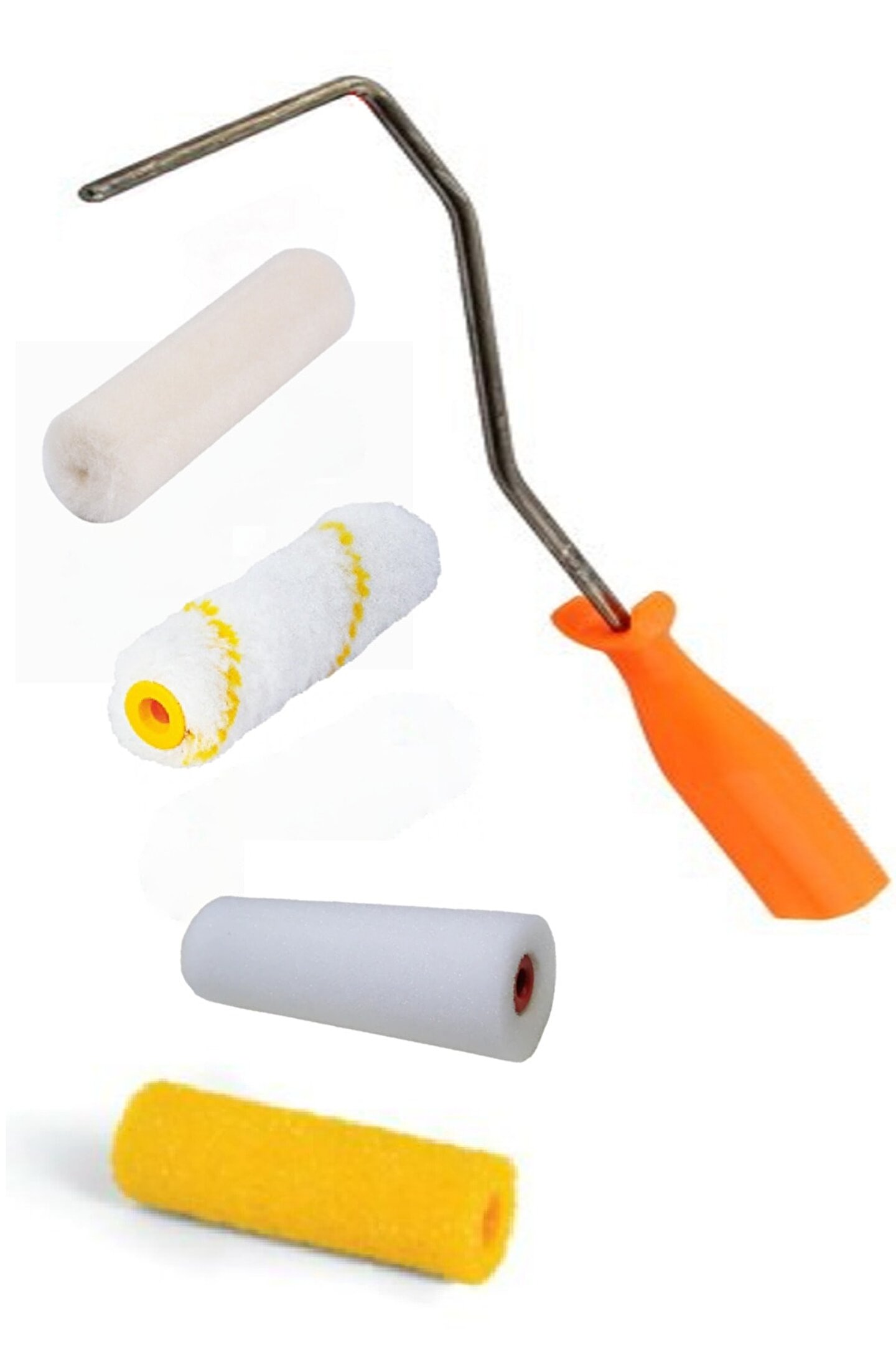 Setimizde her amaca uygun 4 adet rulo ve hepsine uyumlu 1 adet sap bulunmakta. STANDART BOYAMA İŞLERİ İÇİN POLYAMİD RULO 10CM; YAĞLI-AKRİLİK BOYA İÇİN SÜNGER RULO 10CM; VERNİK-CİLA İÇİN KADİFE RULO 10CM; DOKU ELDE ETMEK İÇİN (ÖZELLİKLE GRENLİ BOYADA) MERCAN RULO 10CM;