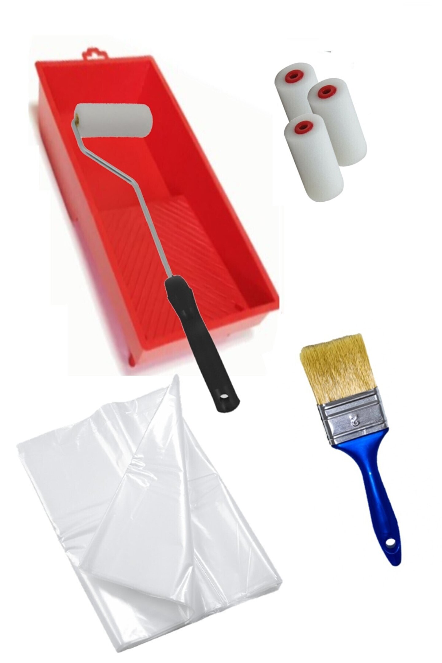 BOYA KABI (BOYA TAVASI) 24X27CM; 10 CM SÜNGER RULO TAKIM; 10 CM SÜNGER RULO YEDEK (3 ADET); 2 NUMARA BOYA FIRÇASI; 10 M2 ZEMİN EŞYA BOYA KORUMA ÖRTÜSÜ (HIŞIR ÖRTÜ);
