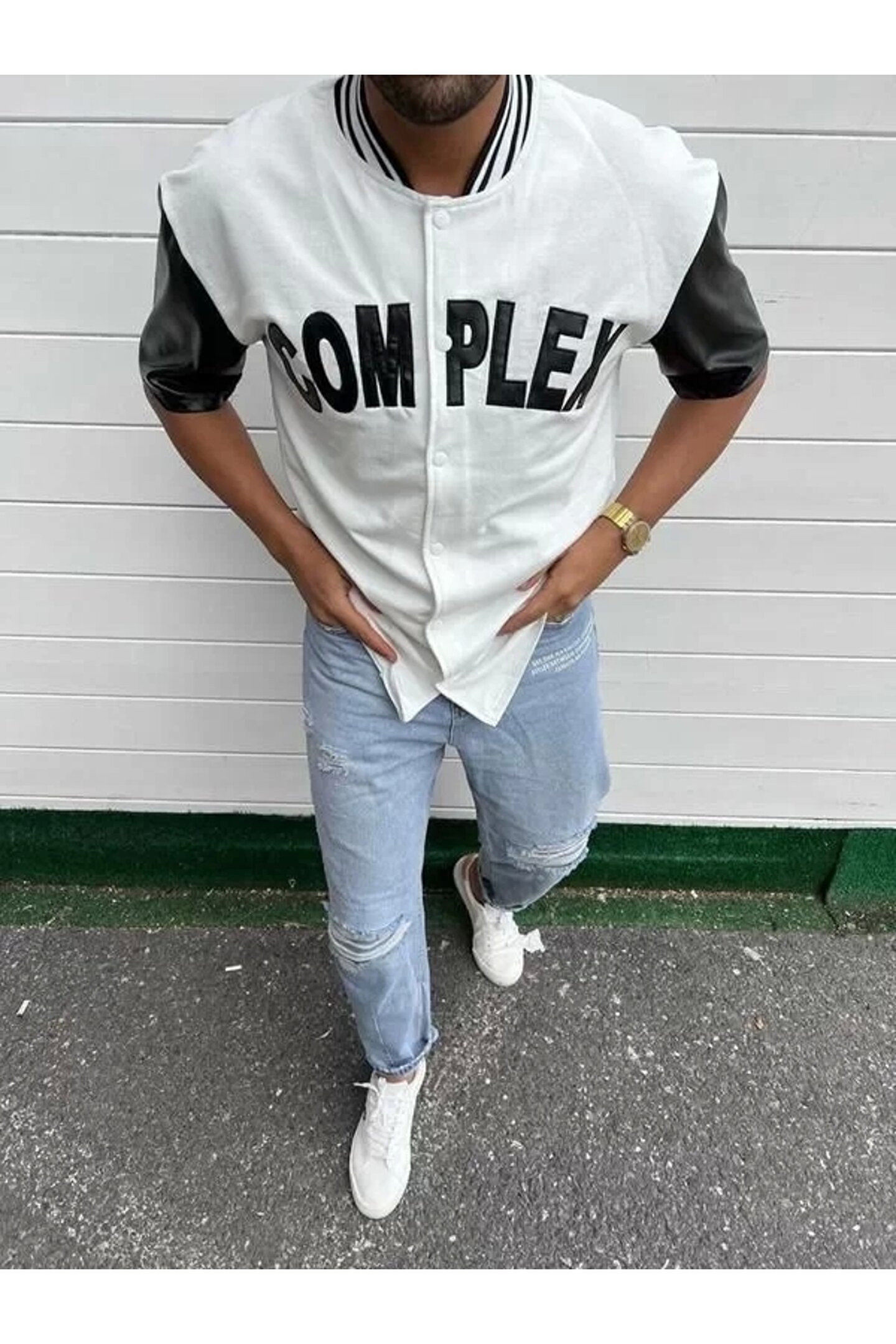 Erkek Complex Kolları Deri Kolej Oversize T-Shirt - Beyaz
