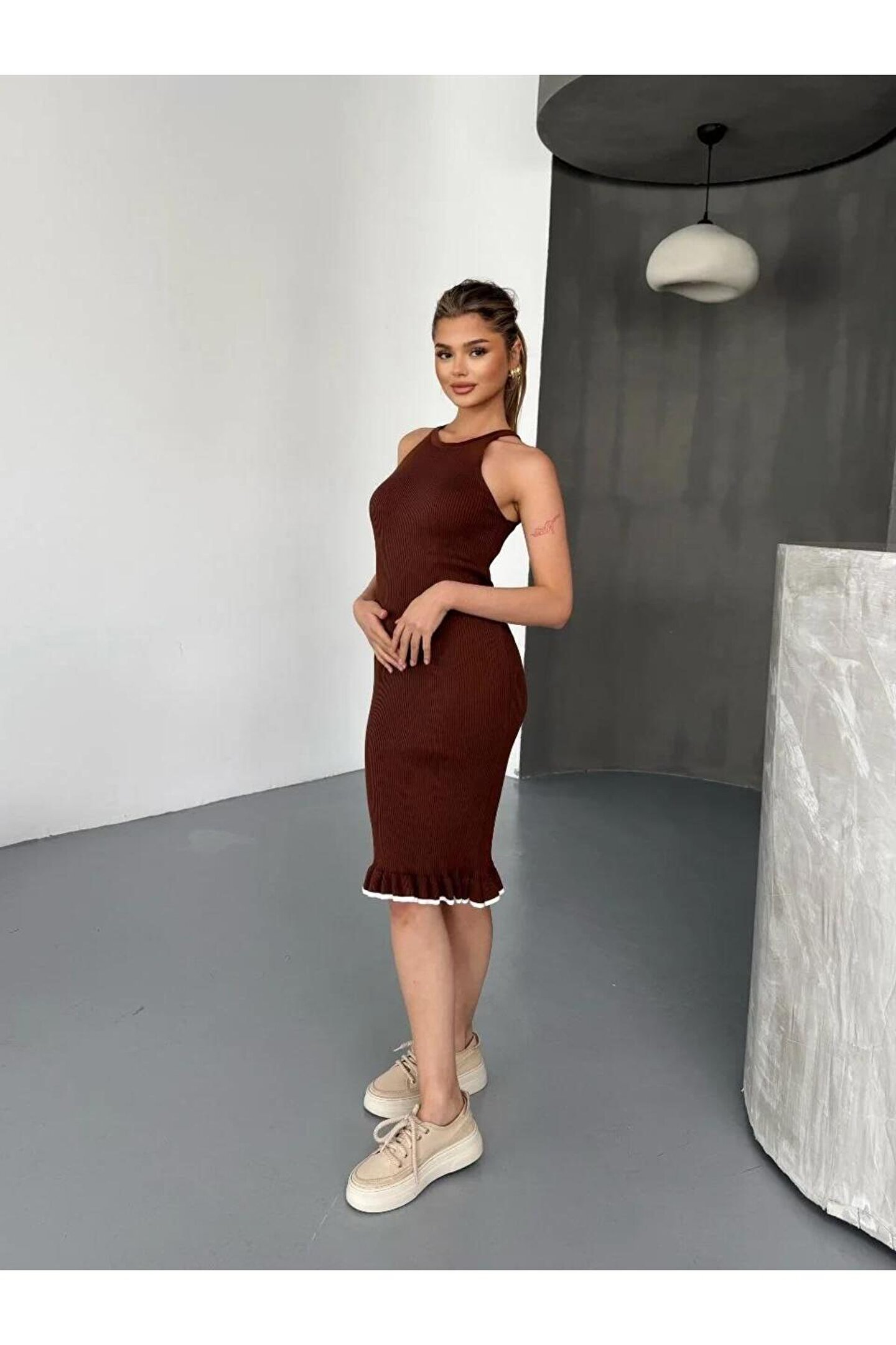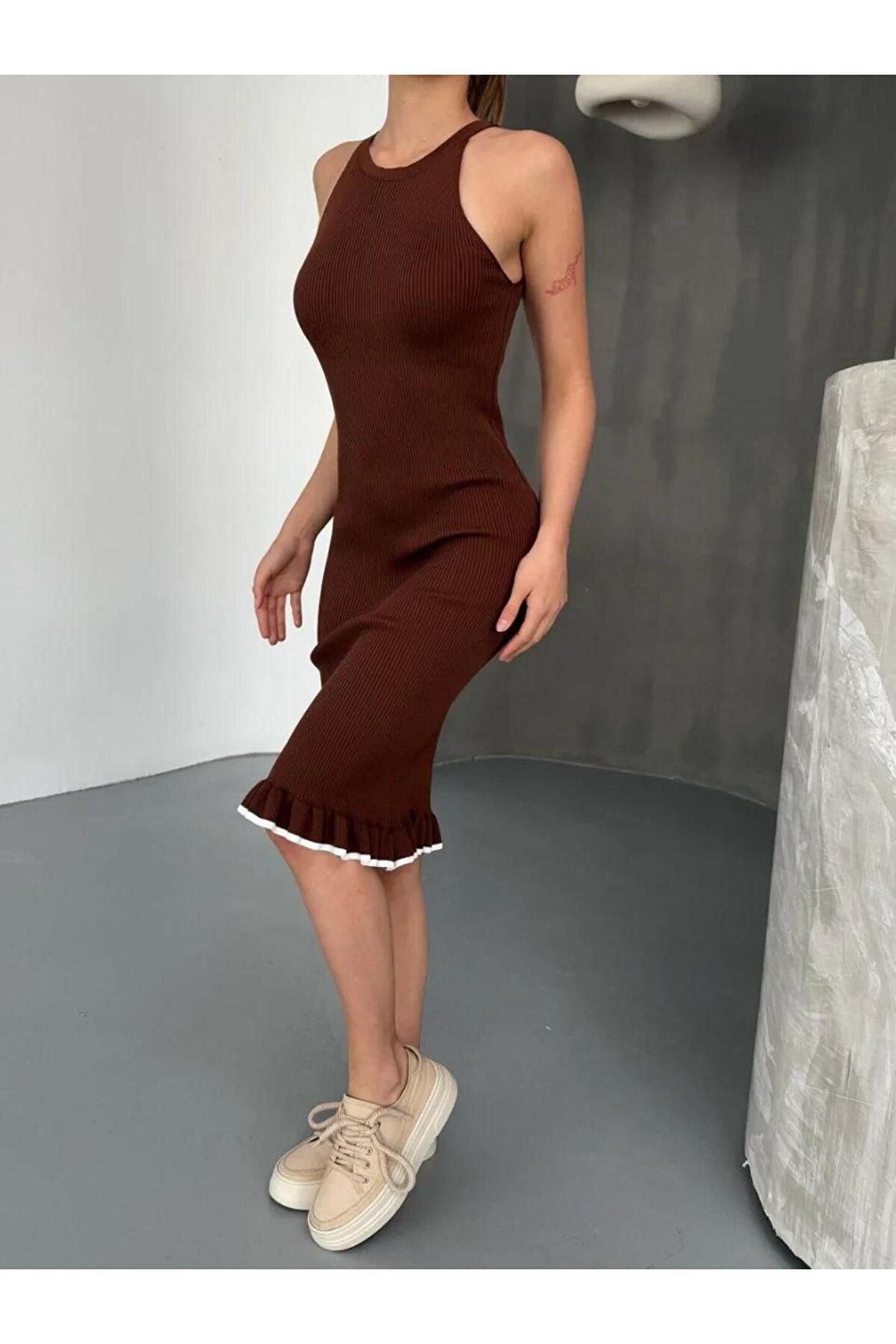 - Günlük kullanım için ideal, rahat ve şık bir tasarıma sahip.; - Orta kalınlıkta triko materyali ile mevsim geçişlerinde konfor sağlar.; - Kolsuz tasarımı sayesinde yaz aylarında serinlik hissi verir.; - Baskısız yüzeyiyle sade ve zamansız bir görünüm sunar.; - Cepsiz yapısı ile minimalist ve düzgün bir siluet oluşturur.; - Kutu içermeyen ambalajı ile doğrudan kullanım kolaylığı sağlar.; - Cool & Comfort persona'ya uygun, rahat ve stil sahibi bir görünüm sunar.; - Halter yaka detayı ile modern ve feminen bir hava katar.; - Astarsız yapısıyla hafiflik ve konforu artırırken, kemersiz tasarımıyla rahat hareket etme olanağı tanır.; - Triko materyali sayesinde yumuşak dokunuş ve dayanıklılık sunar.; - Tüm sezonlar için uygun olan bu elbise, her mevsimde şıklığınızdan ödün vermezsiniz.; - Kapsız tasarımı ile hafif ve serin bir kullanım deneyimi yaşatır.; - Düz deseniyle kolayca kombinlenebilir ve zarif bir görünüm kazandırır.;