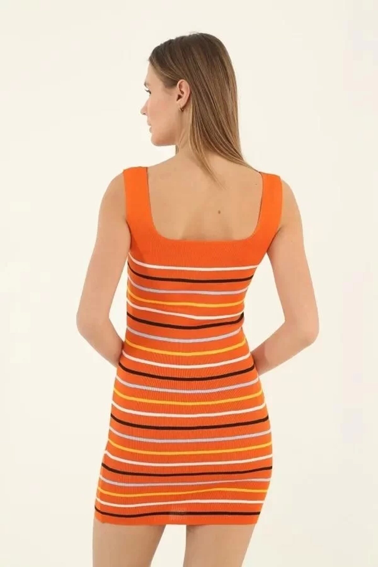 Flexium Kadın Kare Yaka Midi Boy Likralı Polelit Elbise - Turuncu