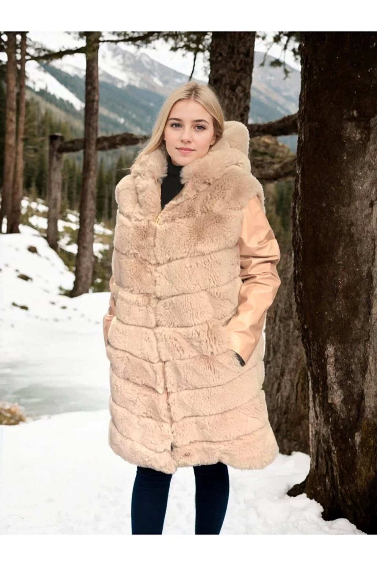 Kadın Suni Kürk Hakiki Deri - Somon