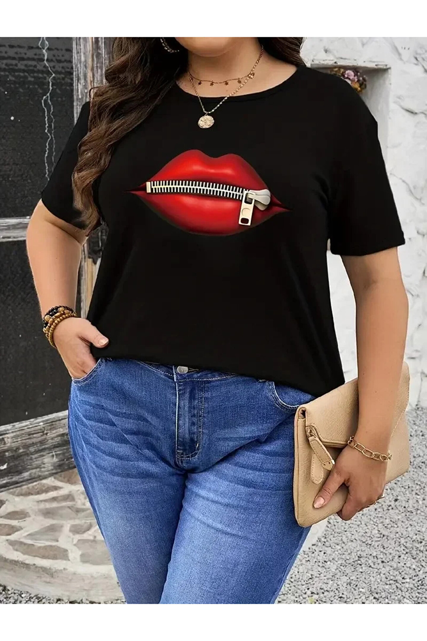Flexium Velmora Premium fermuar dudak baskılı tişört bisiklet yaka kısa kollu tişört - Siyah -VLMR