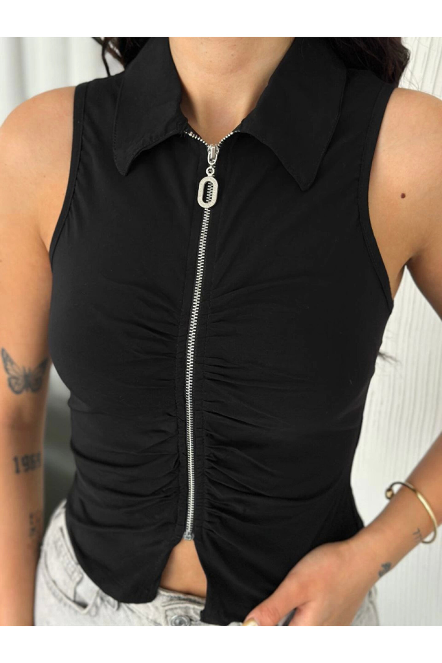 Yakalı Tam Fermuarlı Kolsuz Bluz - Siyah